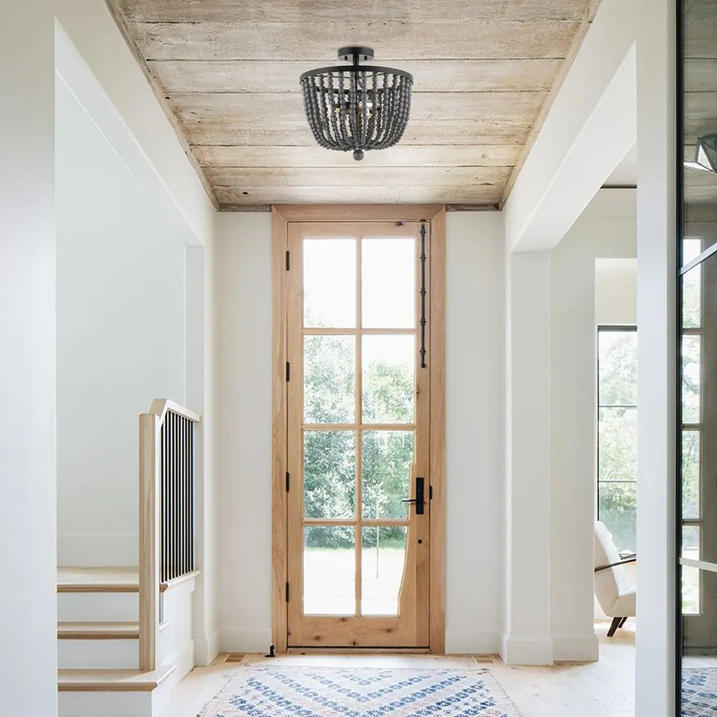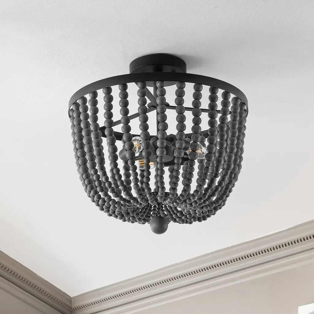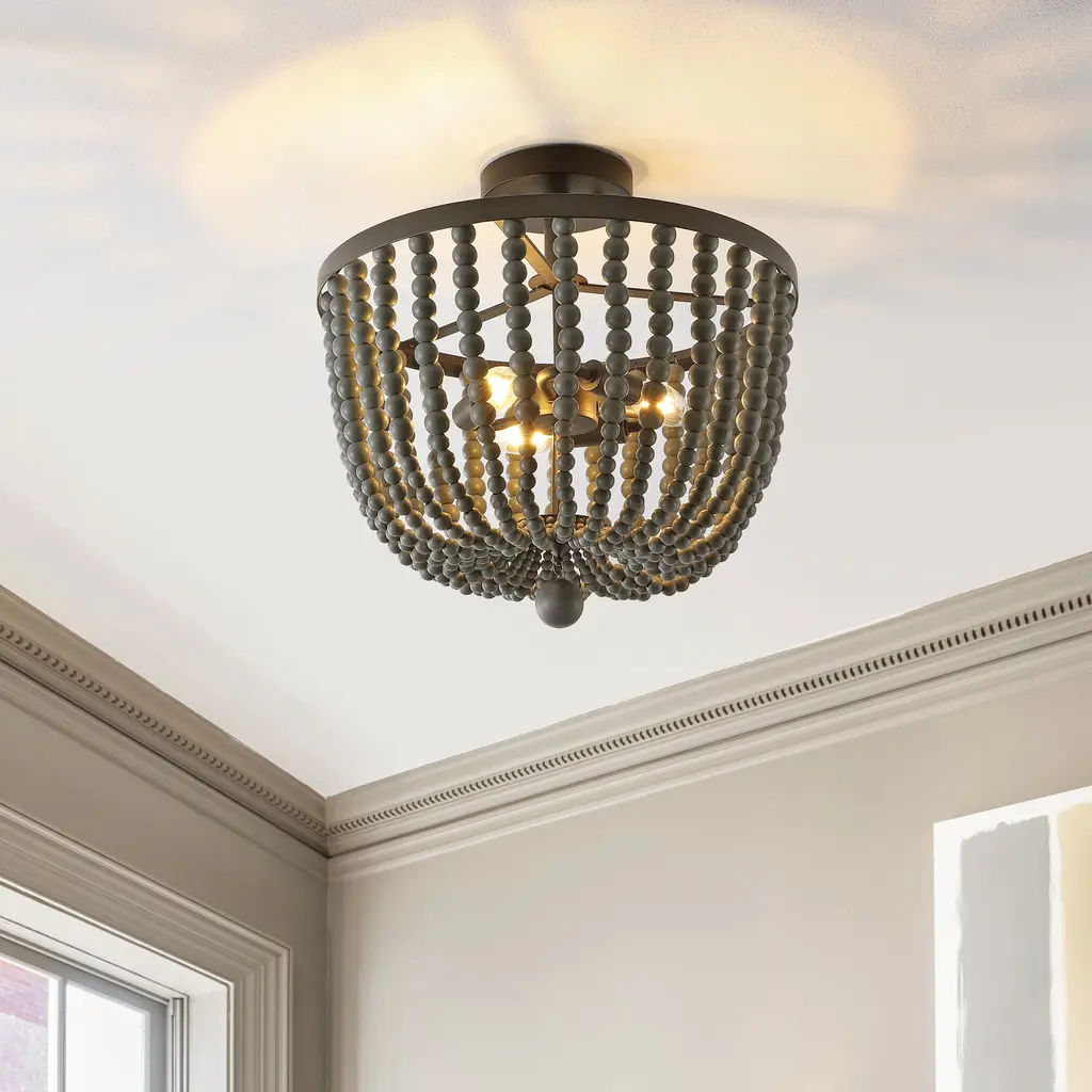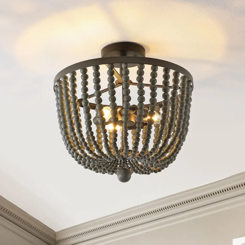 This unique ceiling light features driftwood gray wood beads on an elegant rubbed bronze frame that's ideal for rustic, coastal and Bohemian interiors. LED bulbs provide plenty of bright, clear light. This versatile ceiling fixture is perfect for the hallway, closet, living room, bedroom or entry.Features:Dimensions:About us:You see a lamp.We see a decorative work of art.A perfectly curved shade casts a dramatic shadow on a floor. Compatible with LED lightbulbs: as easy on the environment as they are on the eyes. The JONATHAN Y Lighting collection considers every detail from impeccably sourced materials to designer styling. And our prices are so attractive, we've transformed a functional necessity into a fashion accessory.JONATHAN Y Lighting - a fashion revolution in home decor.