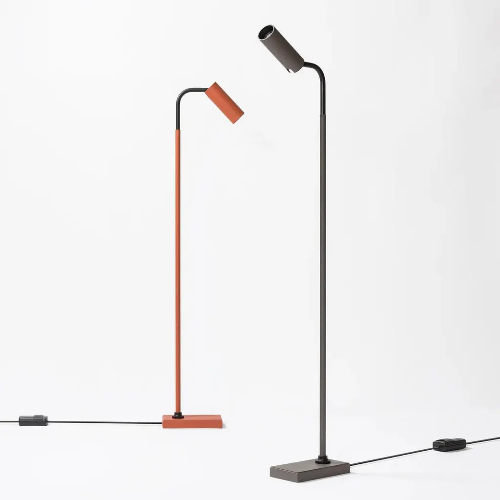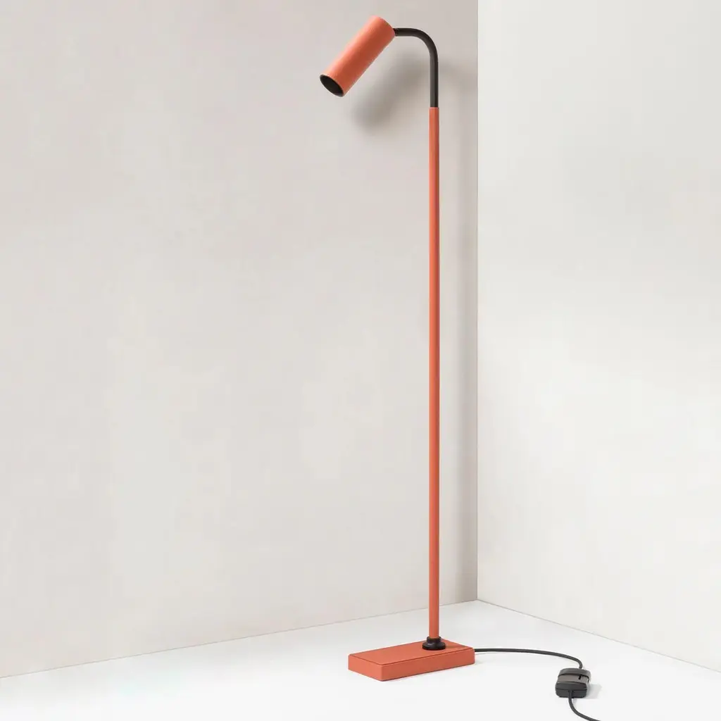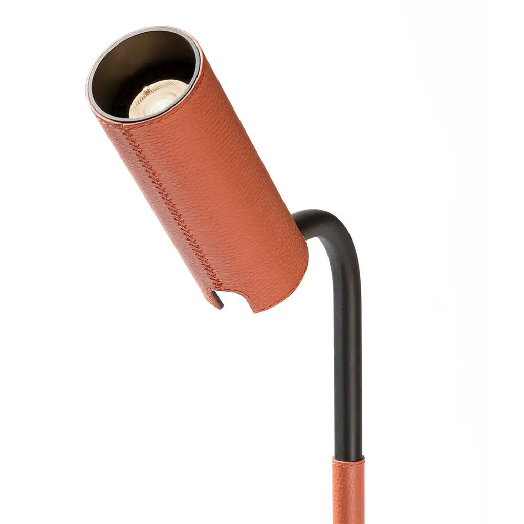 Floor Lamp E-Reader Orange with structure in solid bronzed covered with genuine leather in orange finish. Base in solid bronze covered with genuine leather in orange finish. Floor Lamp with vertical placed tube on knuckle joint, 350° turnable, 90° adjustable and a 2 meter cable, plug and a foot control dimmer. Lamp Holder type GU10 for Soraa GU10, 230Volts, 9,5Watt, 36° Vivid CRI 95 490 lm included. Main power 230V 50 Hz.bulb not included.Also available on request in 110Volts for America standards.Also Available on request in E-Reader Grey Floor Lamp.Also available on request with other leather colors.