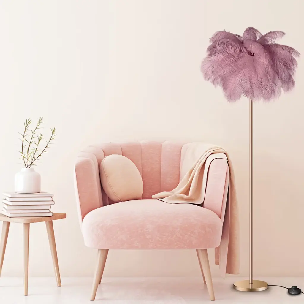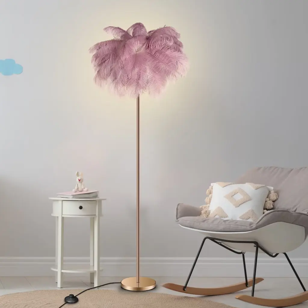 Easyinbeauty Natural Ostrich Feather Floor Lamp With Foot Switch, Cozy Lighting For Girl Bedroom, Reading Corner - Bean Paste Pink