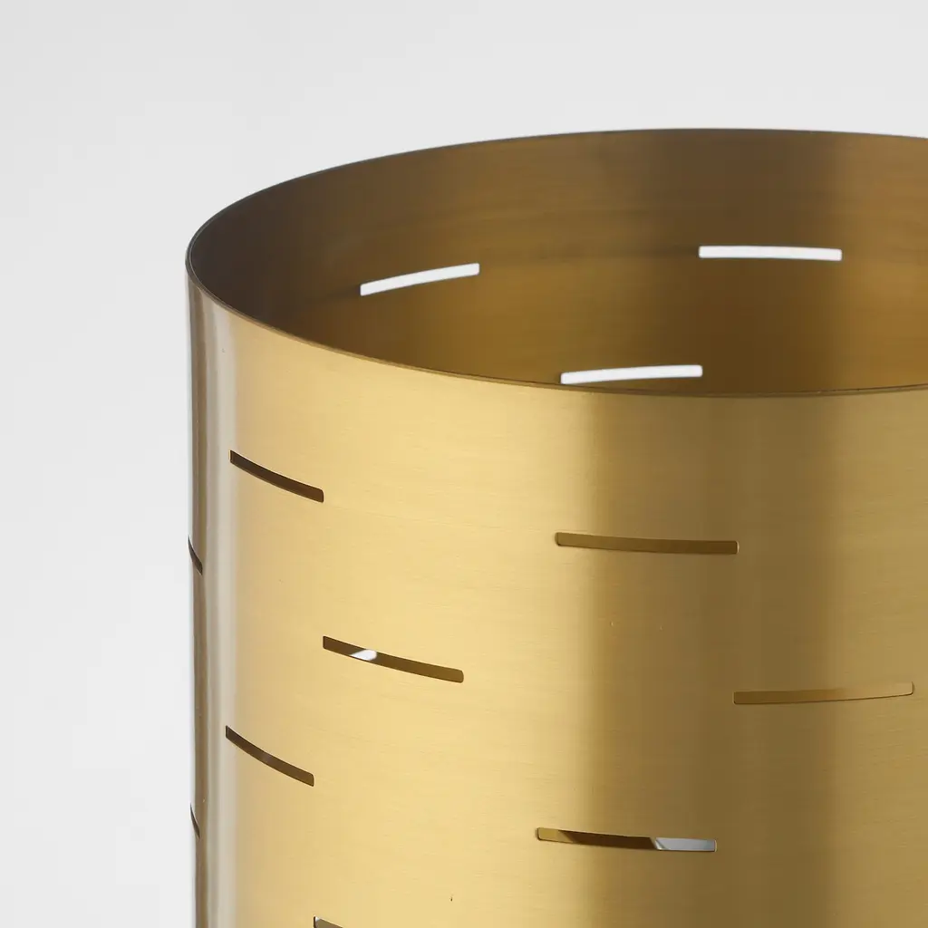 EBBEMÅLA Floor lamp - brass color. Creates a soft, cozy mood light in your room. Creates a decorative light pattern in the room when the light shines through the perforated shade. This product bears the CE mark.