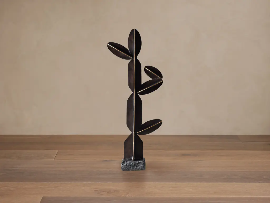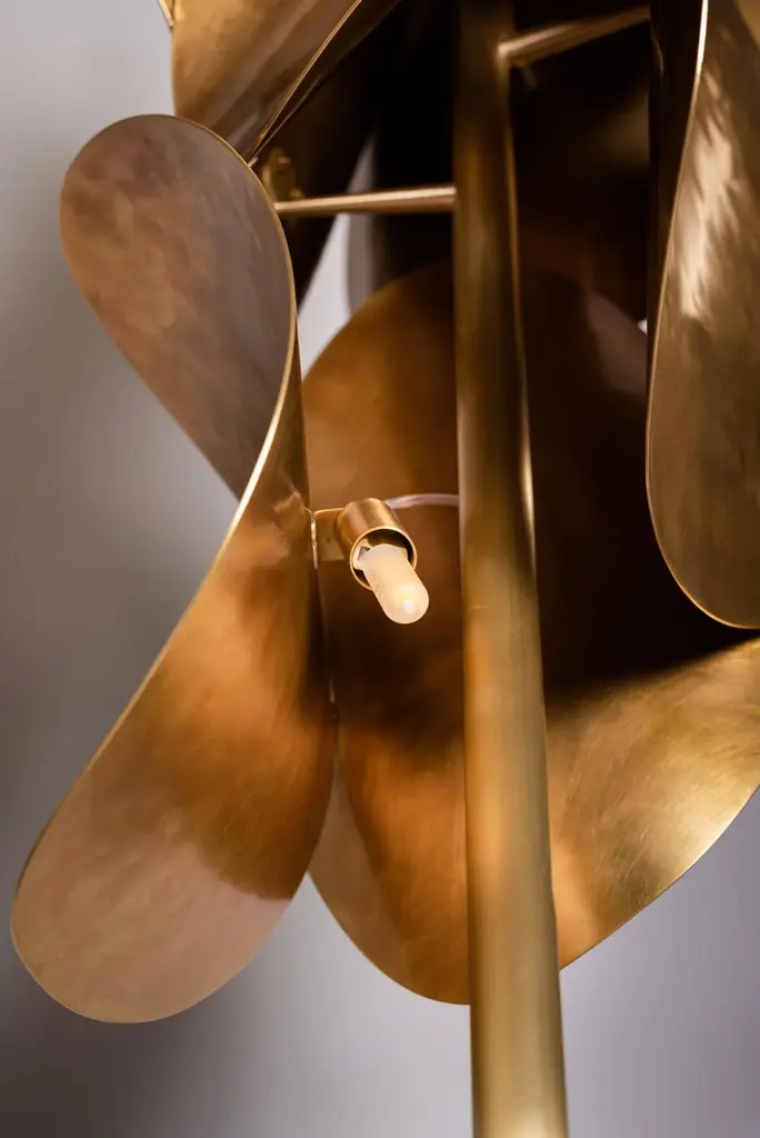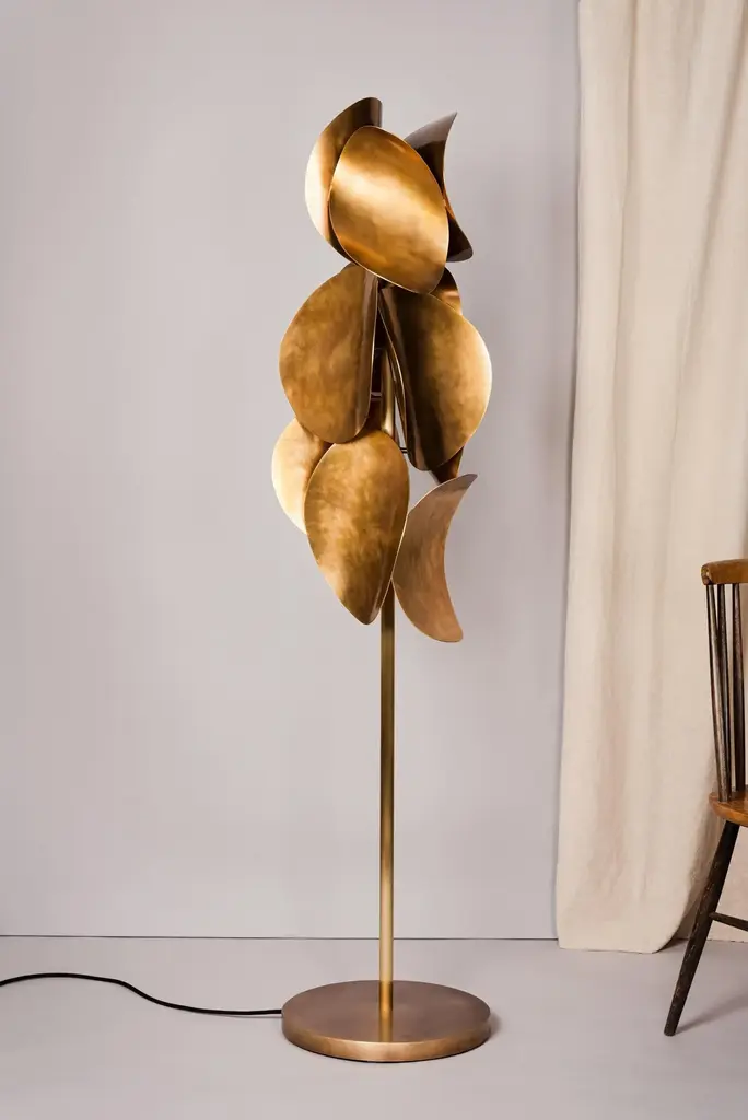 Echo floor lamp by Atelier Demichelis. Numbered and Signed. Dimensions: D 38 x H 166 cm Materials: Patinated and Varnished Brass. Laura Demichelis was born & brought up in Provence, in the south of France. Trained at the École Boulle in Paris, she obtained her Diploma in Arts & Crafts, specialising with work in bronze. Her Diploma piece, the ‘Dérive’, won her the top national prize in the competition which the Riboud Foundation sponsors at the National Institute of Arts & Crafts (Inma); & the piece has been frequently exhibited. After several years’ work with the designer Van Der Straeten in his atelier in Paris, she spent a year in Asia, in particular studying ancient bronze-casting techniques in Vietnam. Her creativity was hugely enriched by her familiarisation with precious traditional know-how. In 2014, she settled in Berlin, where for 2 years she worked with the designer Stefan Leo & was introduced to different techniques & new materials, like leather, parchment, glass, thus adding to her design repertoire. In 2016, she set up on her own in the centre of Toulouse: Atelier Demichelis, where she designs & makes contemporary lighting and other furnishings & fittings in bronze. All her creations are hand-made & signed, either one-off or in a short numbered series. Laura draws her inspiration from her travels, but also from nature & daily life — so long as there is a story to tell. Up to 250V (Europe/UK Standard).