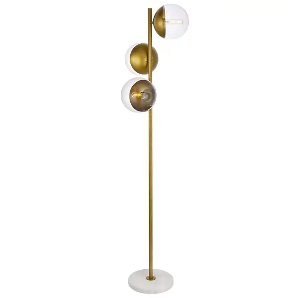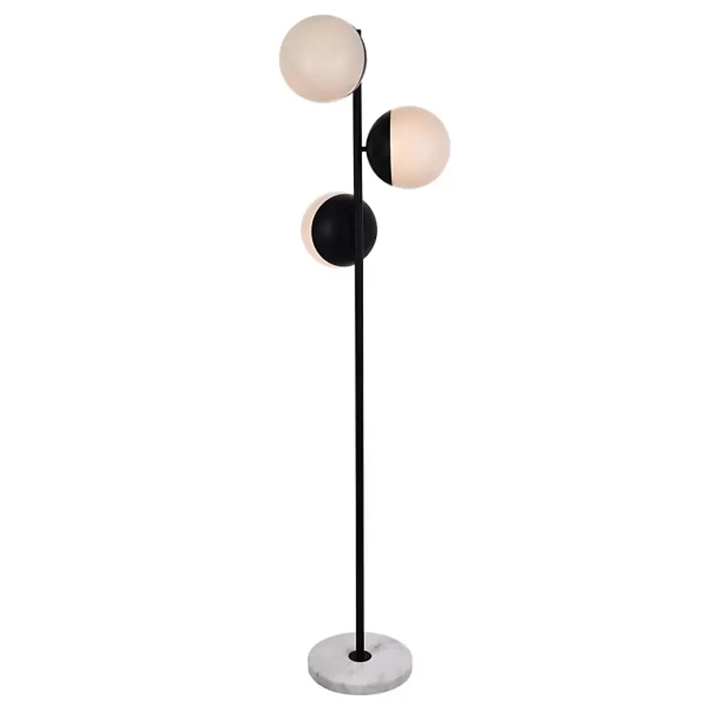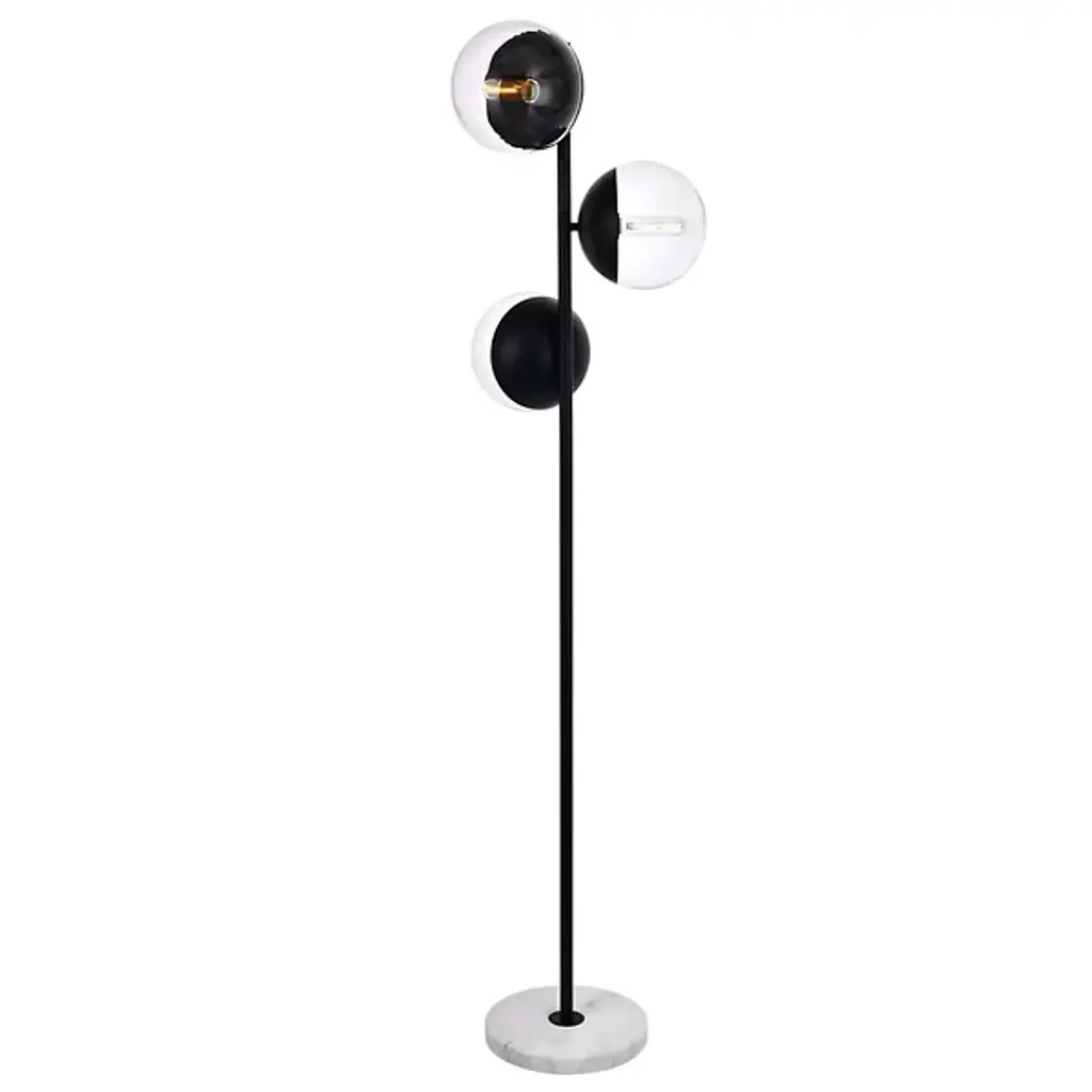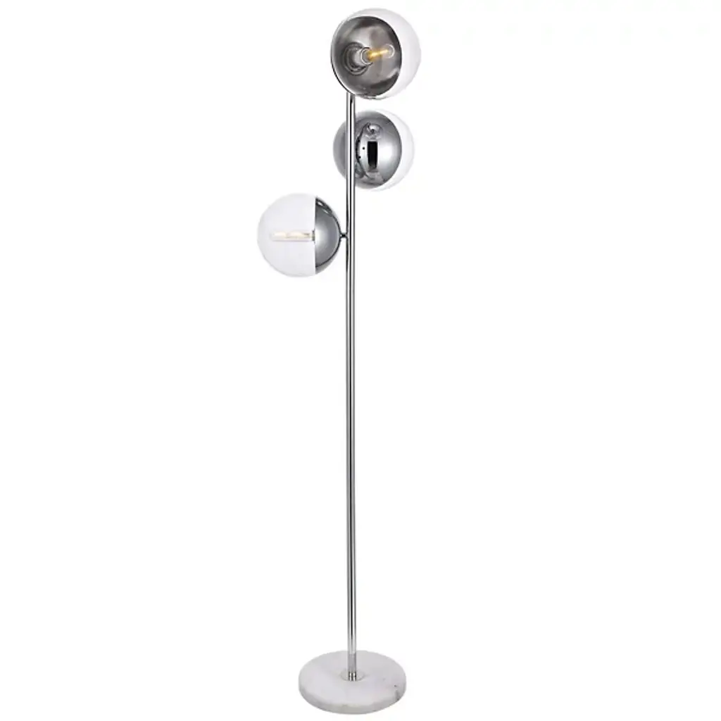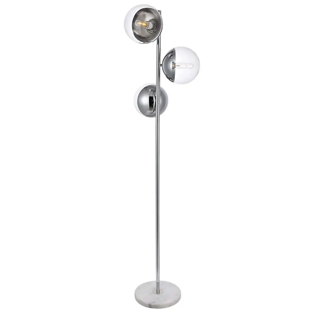 The Eclipse 3 Light Floor Lamp from Elegant Lighting elevates the concept of ambient lighting with its arresting design that seems to capture orbiting planets in mid-motion. Three spherical shades, crafted from delicate glass and lustrous metal, are artfully arranged along a slender metal stem. The lamp's vertical figure is grounded by a marble baseplate. This juxtaposition of materials - the coolness of marble, the warmth of metal, and the translucence of glass - creates a rich textural experience that engages the senses even when the lamp is unlit.