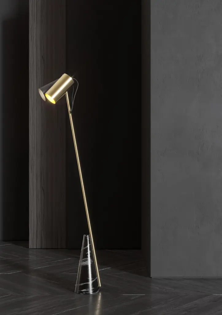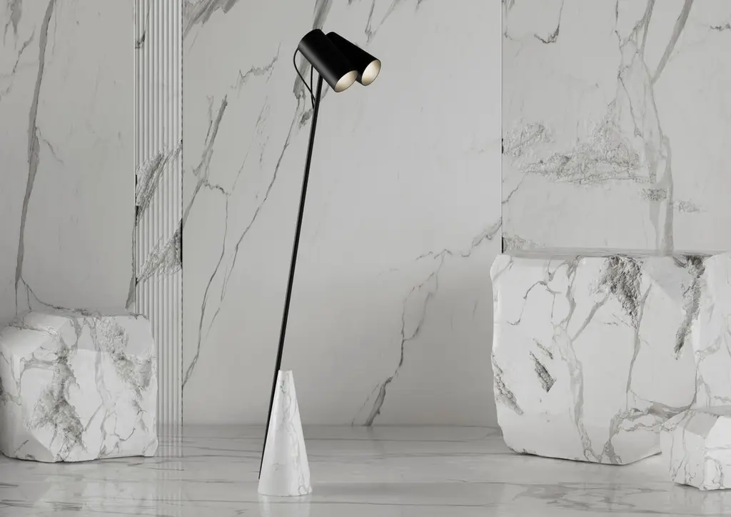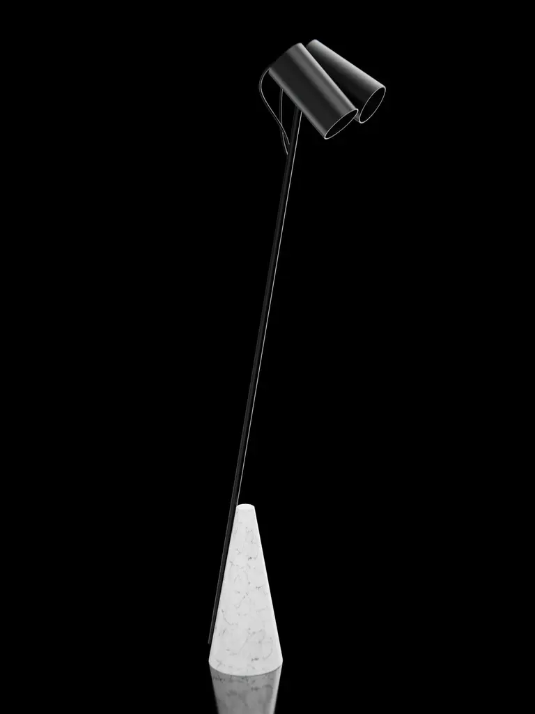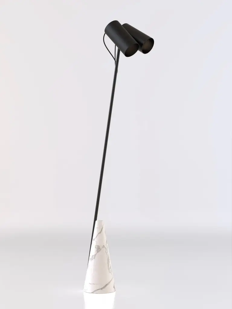 Floor lamp with Carrara white stone base,black paint structure and double black paint lightshield.