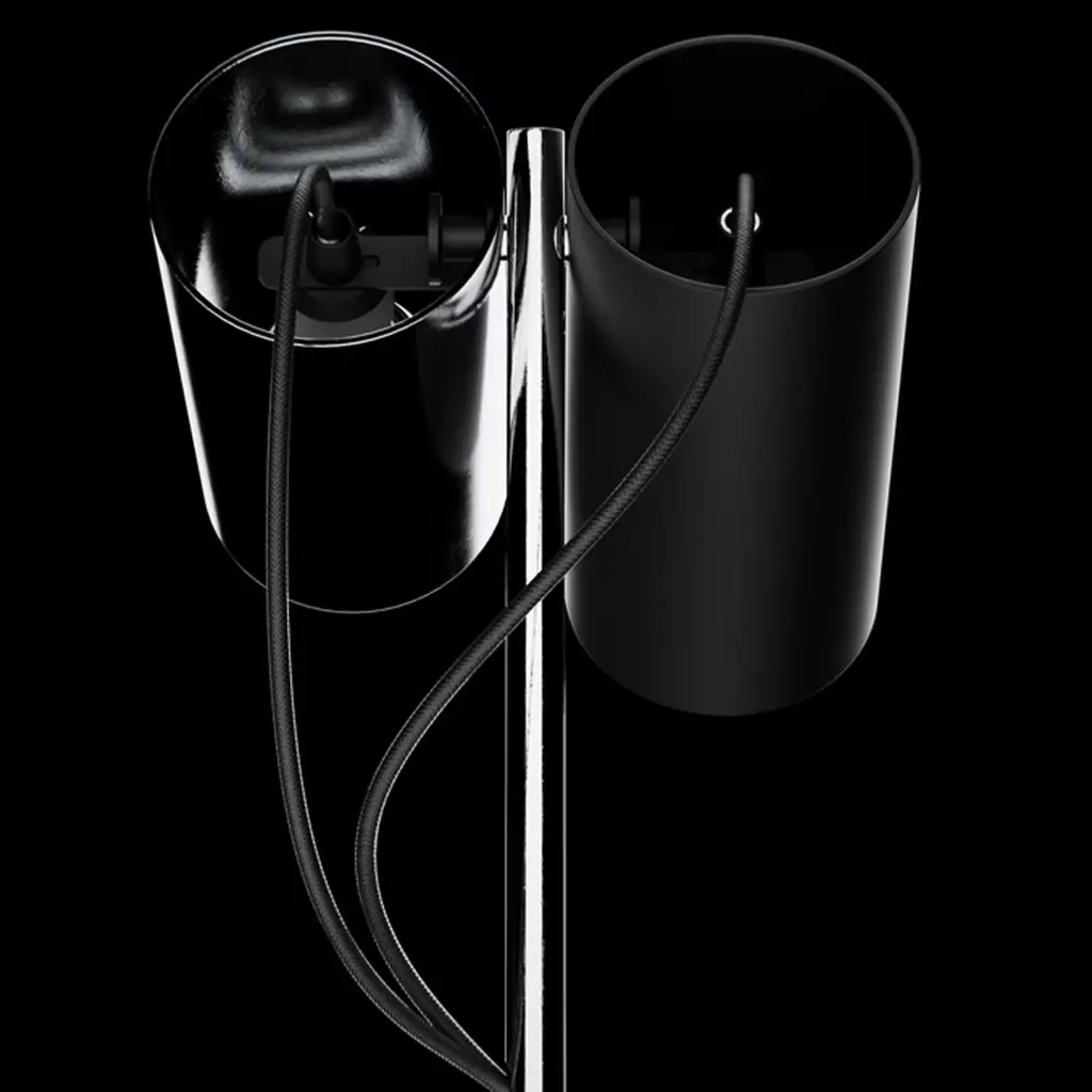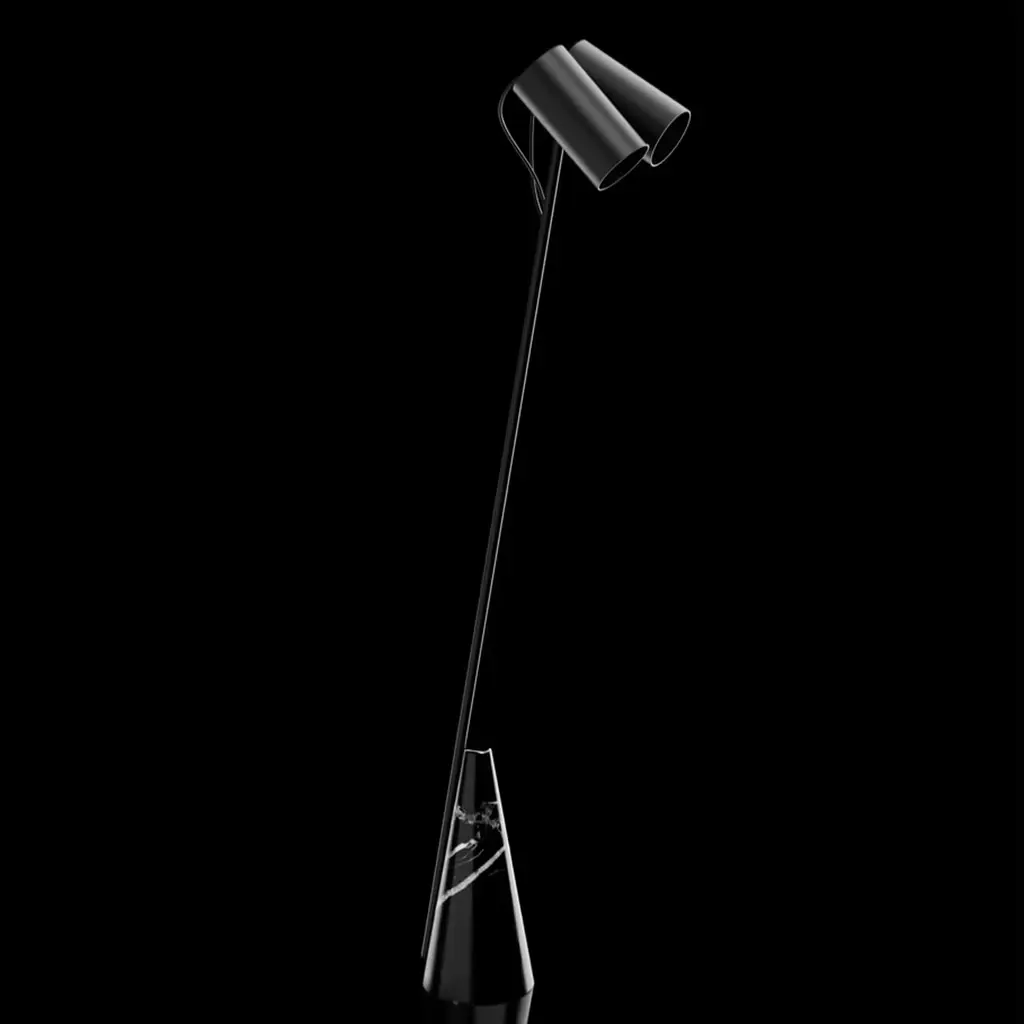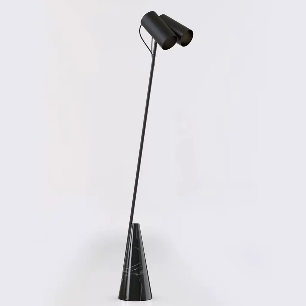 This floor lamp is marked by a striking interplay of geometric lines exuding minimalist flair. Resting on a conical black stone base, the long metal stem is completed with two cylindrical shades also fashioned of black-lacquered metal.
