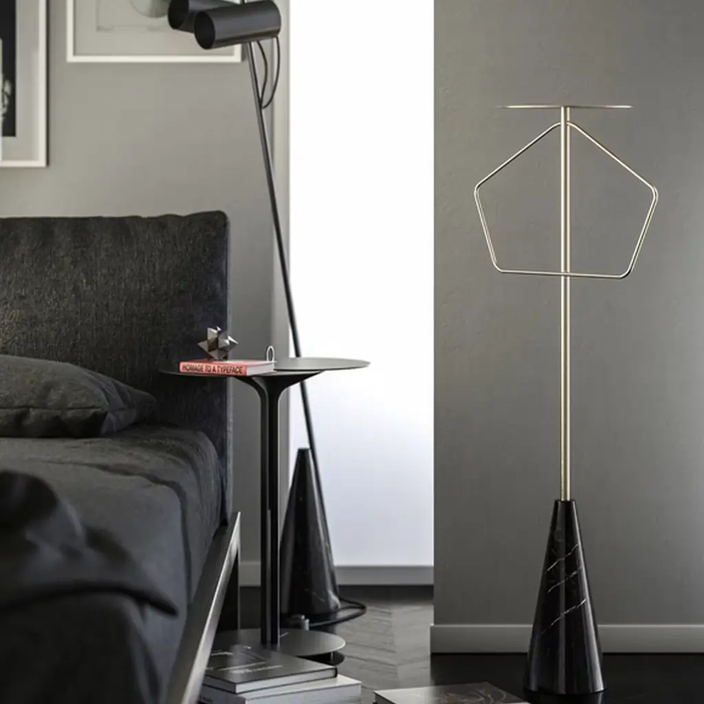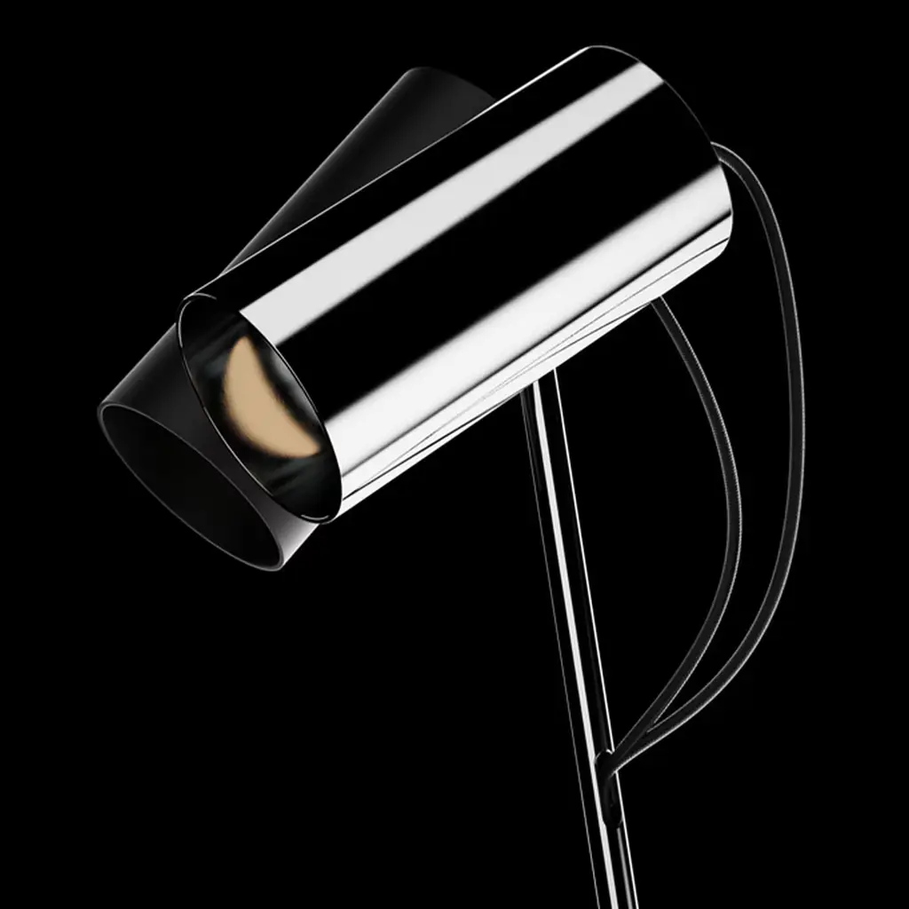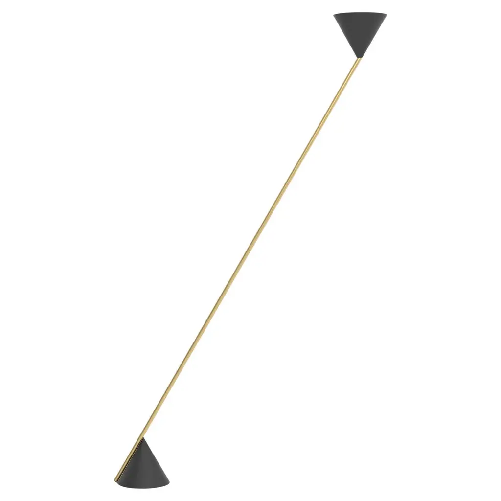 This floor lamp is marked by a striking interplay of geometric lines exuding minimalist flair. Resting on a conical black stone base, the long metal stem is completed with two cylindrical shades also fashioned of black-lacquered metal.