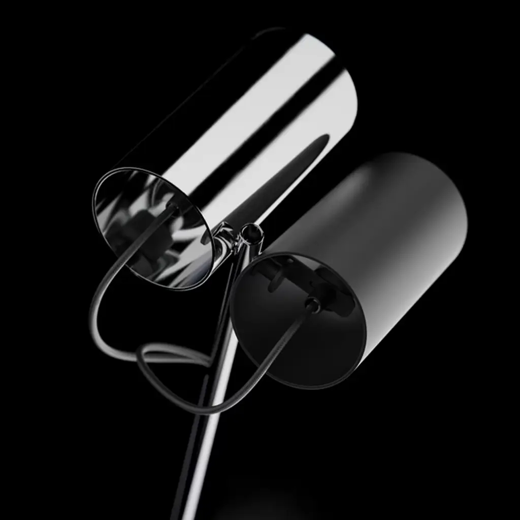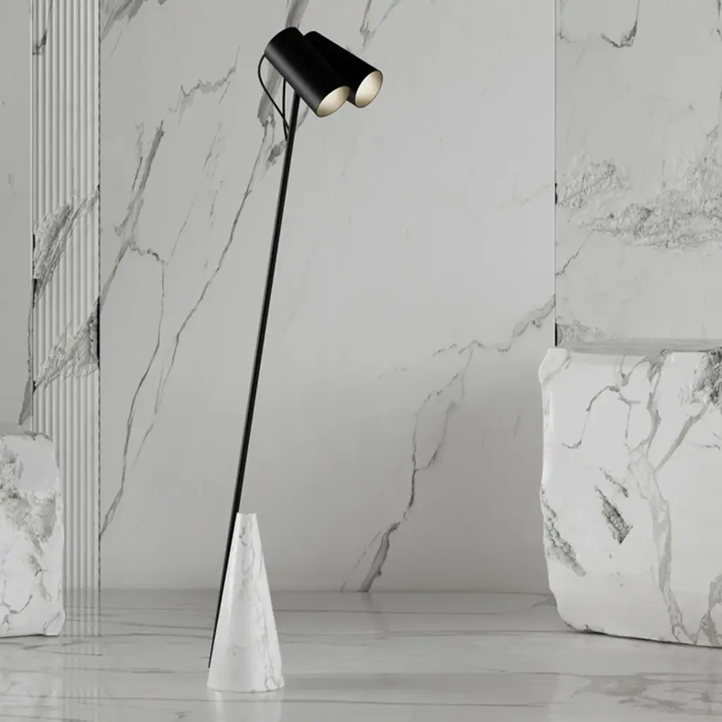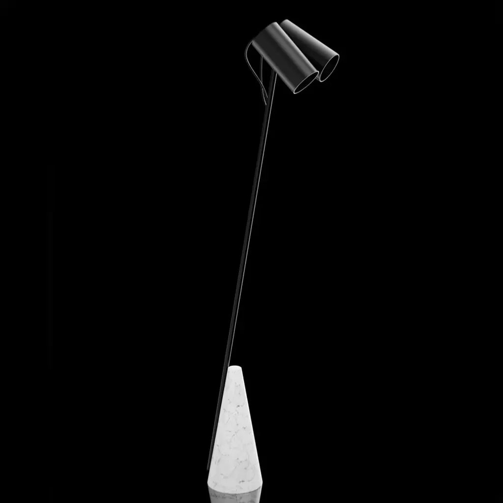 This floor lamp features a conical base crafted of white stone, and exquisitely contrasted to the black-lacquered finish of the metal stem and two cylindrical shades. A refined piece of minimalist design, it will elevate the look of a modern decor.