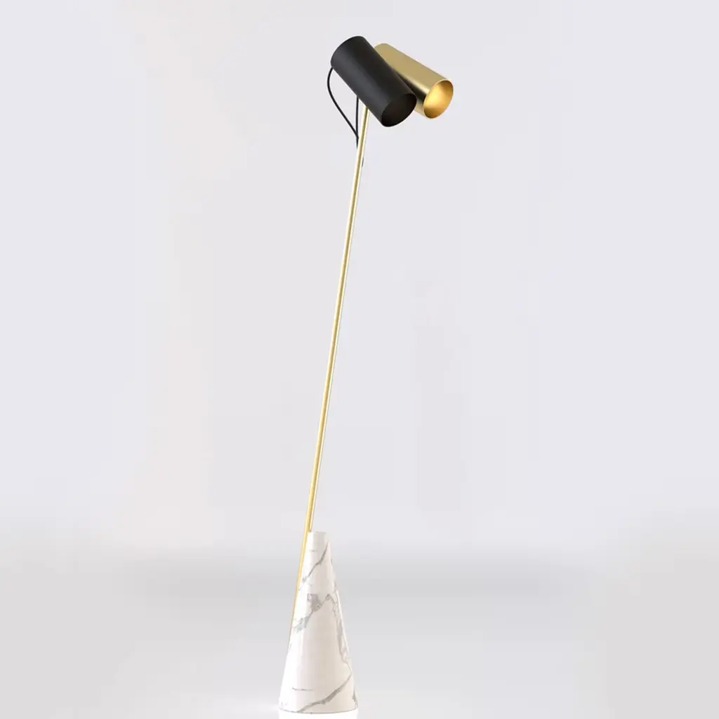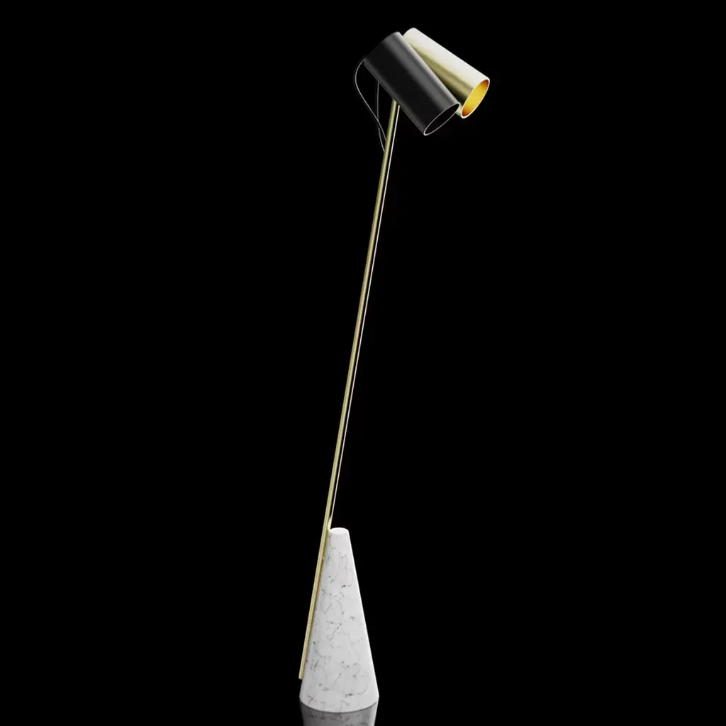 Elegant and refined, this floor lamp is a tribute to minimalist design. Boasting a linear silhouette, it features a conical base fashioned of splendid white stone from which extends a long brass-finished metal stem, completed with two cylindrical shades marked by a brass finish and a black lacquer respectively.