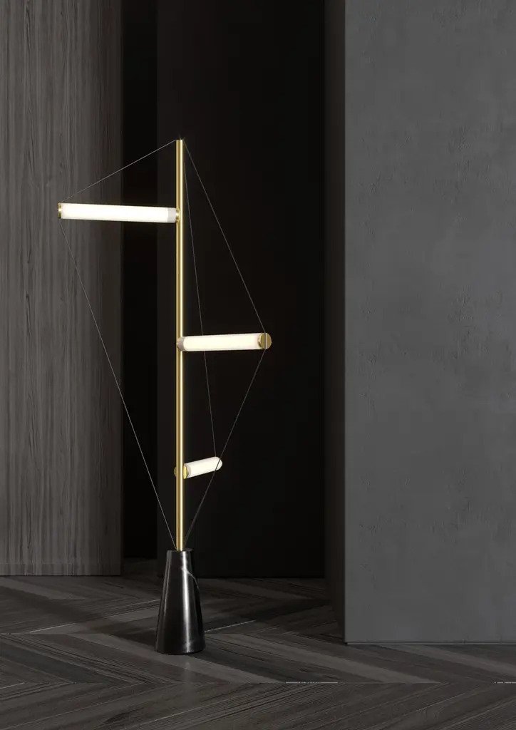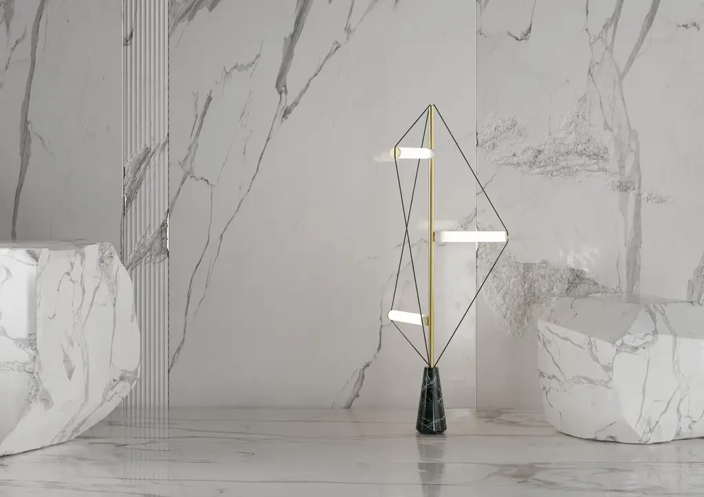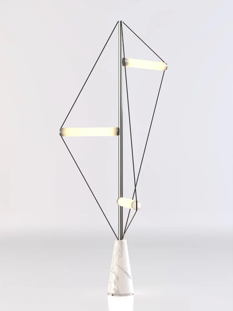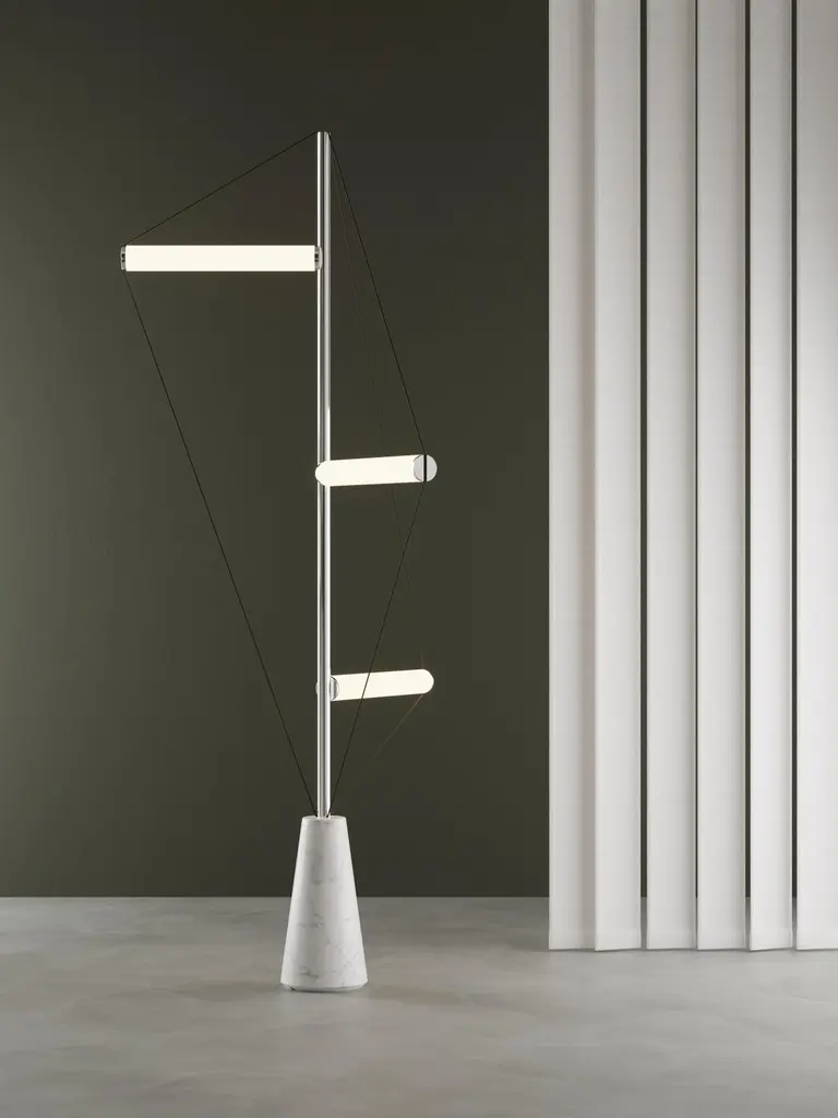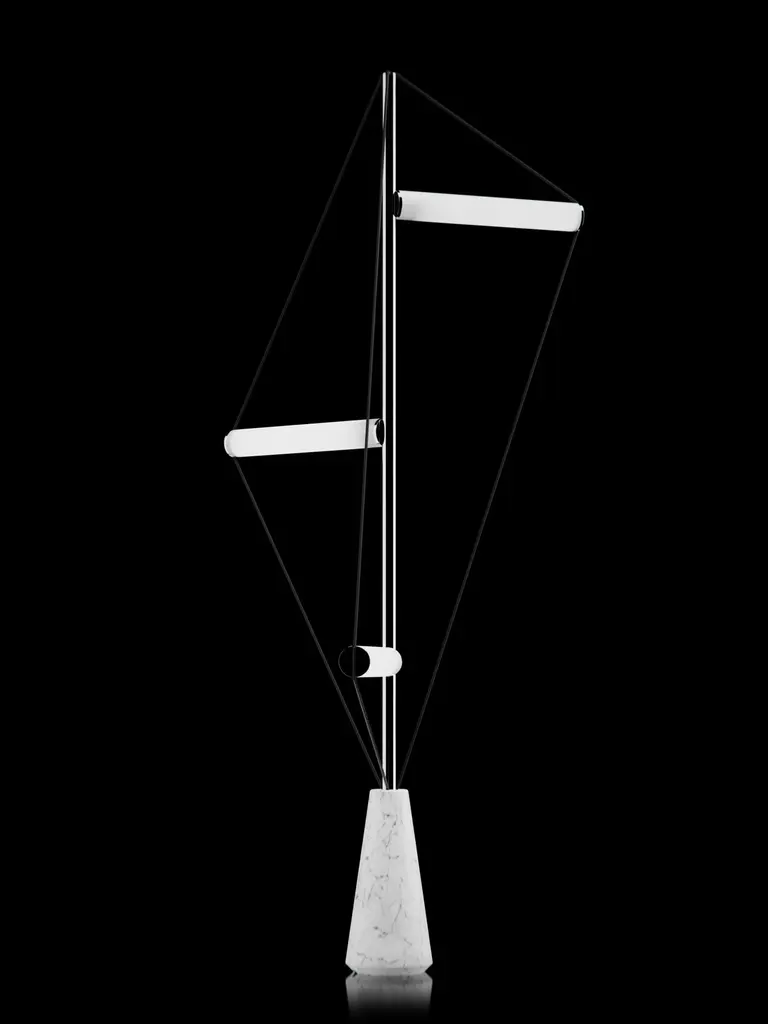 Floor lamp with Carrara white stone base, chrome structure and frosted light tubes.