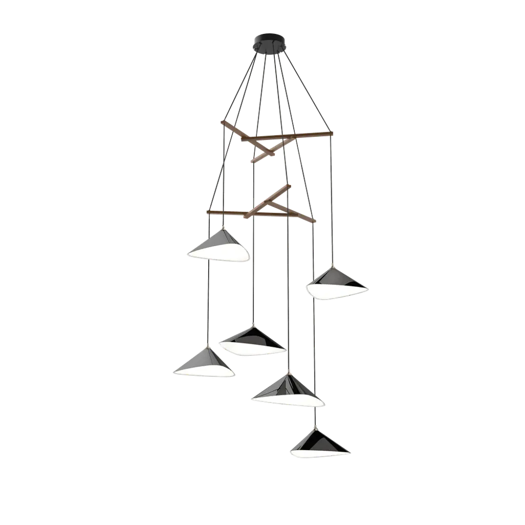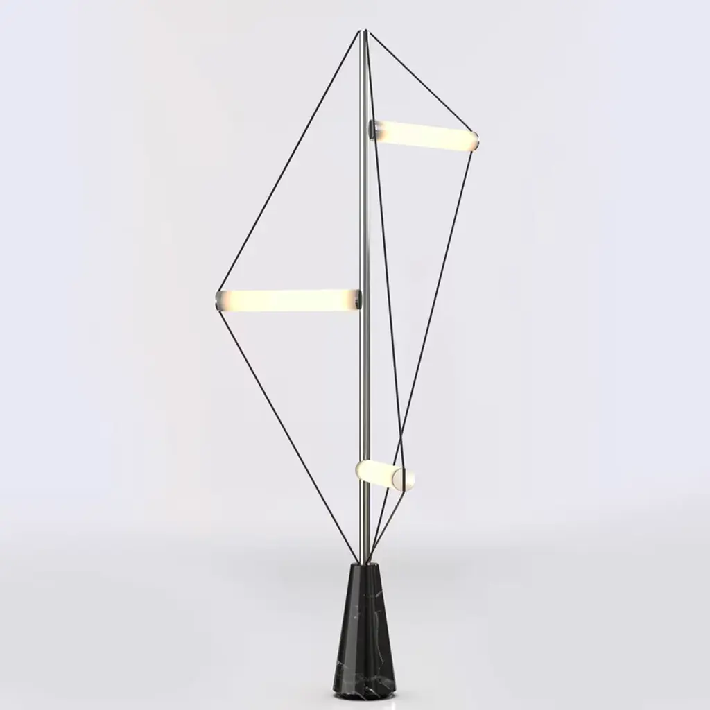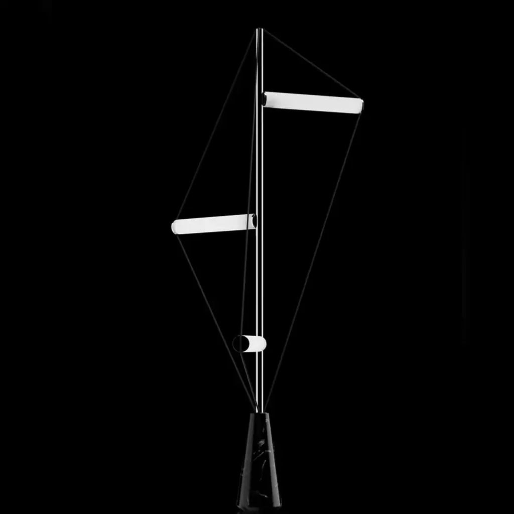 A design statement in any room, this stunning floor lamp features a geometric silhouette evocative of a sailboat’s main mast that will radiate elegance in any living room or office decor. This sleek and contemporary design features a vertical brass rod supported by a conical base made of black stone with three, frosted LED light tubes held in place by black wires at different heights in a horizontal line. Particularly suitable for a contemporary decor, this bold piece of functional decor is available also in brass with white or black base.