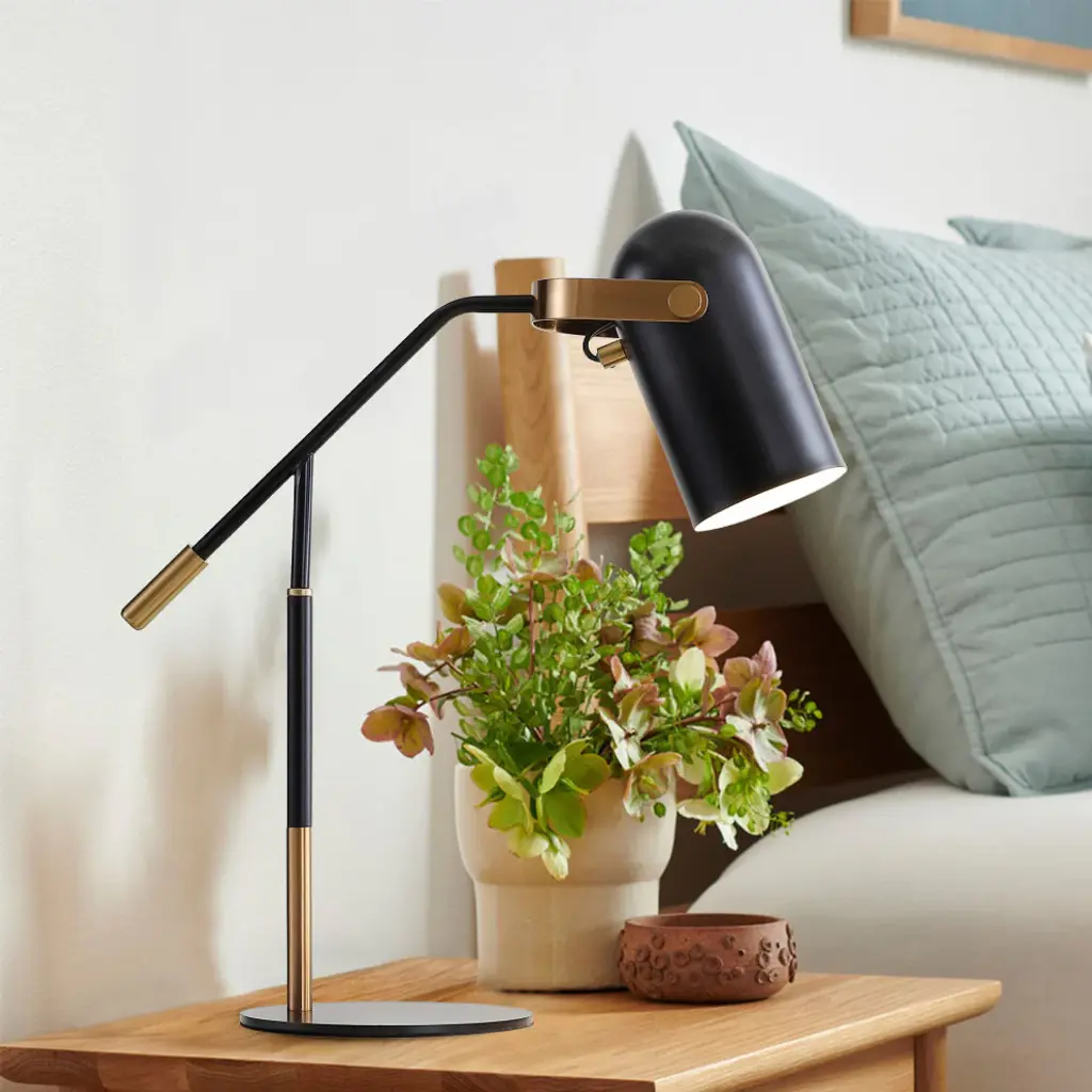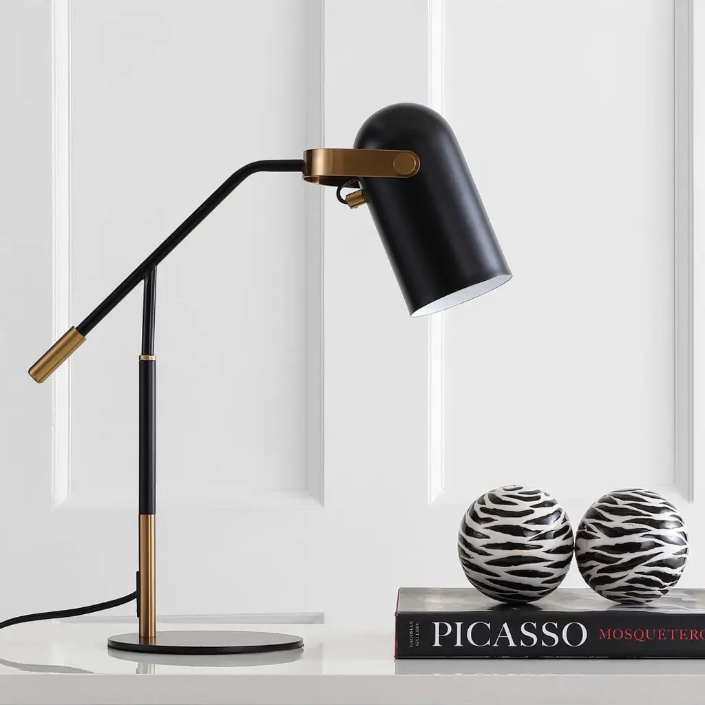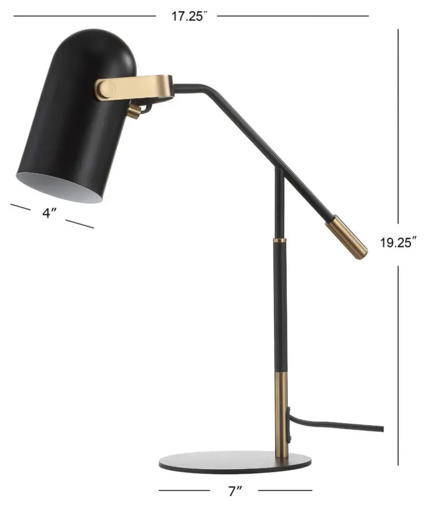 With adjustable focus, this black and brass task lamp is the perfect desk companion whether completing a homework assignment or perusing the newspaper. The design is contemporary and minimalist, while remaining eye catching. The brass accents pair well with the rest of our Edison series, which registers the current trend of gold tone hardware and geometric shapes. Features:Gold and black make for a chic combination in this elegant task lamp The cord is 60" in length and constructed in plastic On-off in-line switchEco-friendly 9W LED bulb includedTakes one bulb and compatible with any 9W LED or 40W TYPE "A" or 13W CFLUL Listed 0Color: Black/Brass GoldBody Material: MetalBase Material: MetalFinial Material: Finial Color: Harp Color: Includes: One (1) lamp(s)Minor Assembly RequiredDimensions:Lamp: 19.25 inches high x 17.25 inches wide x 7 inches deepShade: 7.625 inches high x 4 inches wide x 4 inches deepAbout us:You see a lamp.We see a decorative work of art.A perfectly curved shade casts a dramatic shadow on a floor. A silk cord you never want to hide. LED lightbulbs: as easy on the environment as they are on the eyes. The JONATHAN Y Lighting collection considers every detail from impeccably sourced materials to designer styling. And our prices are so attractive, we''ve transformed a functional necessity into a fashion accessory.JONATHAN Y Lighting - a fashion revolution in home decor.