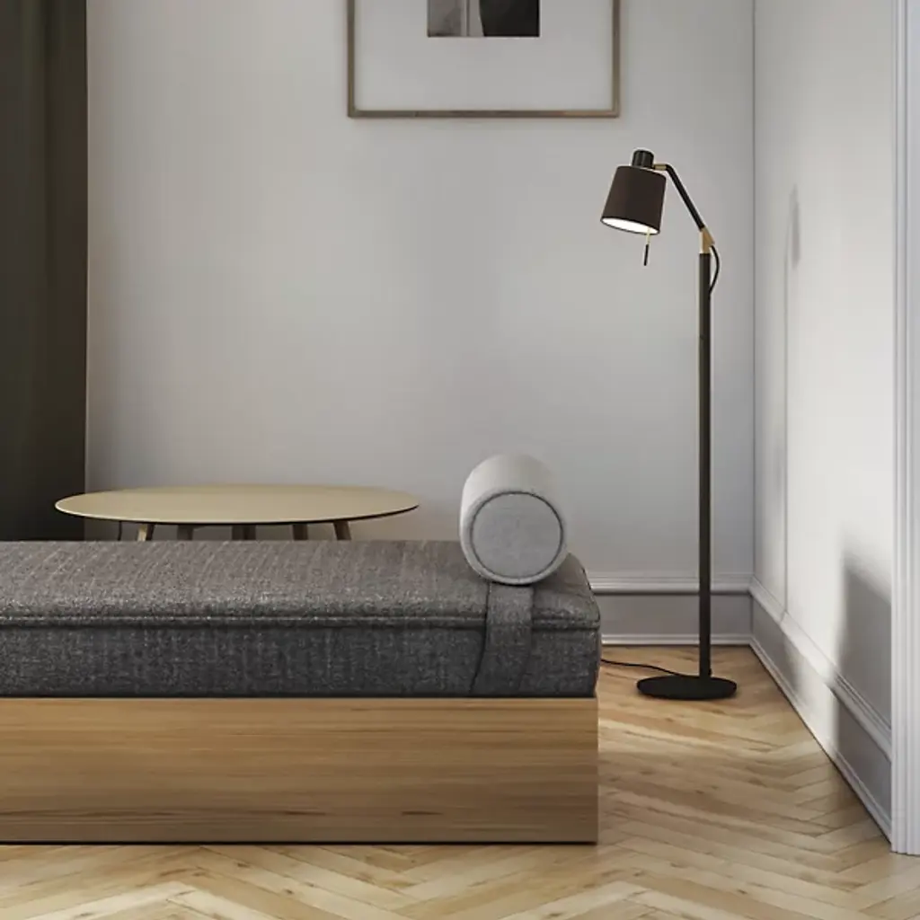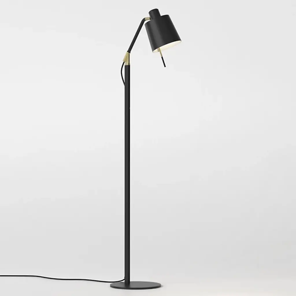 The Edward Floor Lamp from Astro Lighting carries a smooth contemporary sensibility with a touch of vintage refinement. Designed with a focus on adaptable lighting, its matte black steel frame is accented with gold electroplating for a subtle contrast. Built with Astro's QuickBase system, the lamp assembles quickly, its sturdy form suiting lounges, lobbies, or living rooms. A simple switch provides positive control, while the integrated LED inside the cylindrical head delivers efficient, long-lasting illumination. ADA-compliant and adjustable, the lamp pairs practical engineering with rich, brighter detailing, adding luxury to a design strong enough for reliable everyday use.