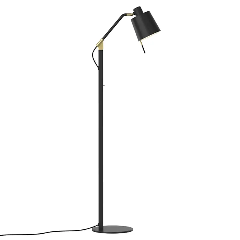 The Edward Floor Lamp from Astro Lighting carries a smooth contemporary sensibility with a touch of vintage refinement. Designed with a focus on adaptable lighting, its matte black steel frame is accented with gold electroplating for a subtle contrast. Built with Astro's QuickBase system, the lamp assembles quickly, its sturdy form suiting lounges, lobbies, or living rooms. A simple switch provides positive control, while the integrated LED inside the cylindrical head delivers efficient, long-lasting illumination. ADA-compliant and adjustable, the lamp pairs practical engineering with rich, brighter detailing, adding luxury to a design strong enough for reliable everyday use.