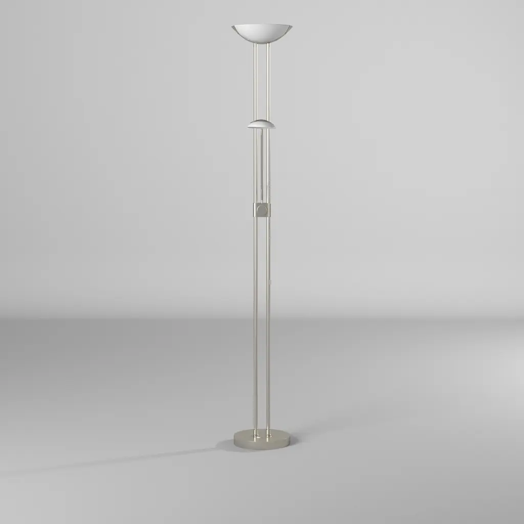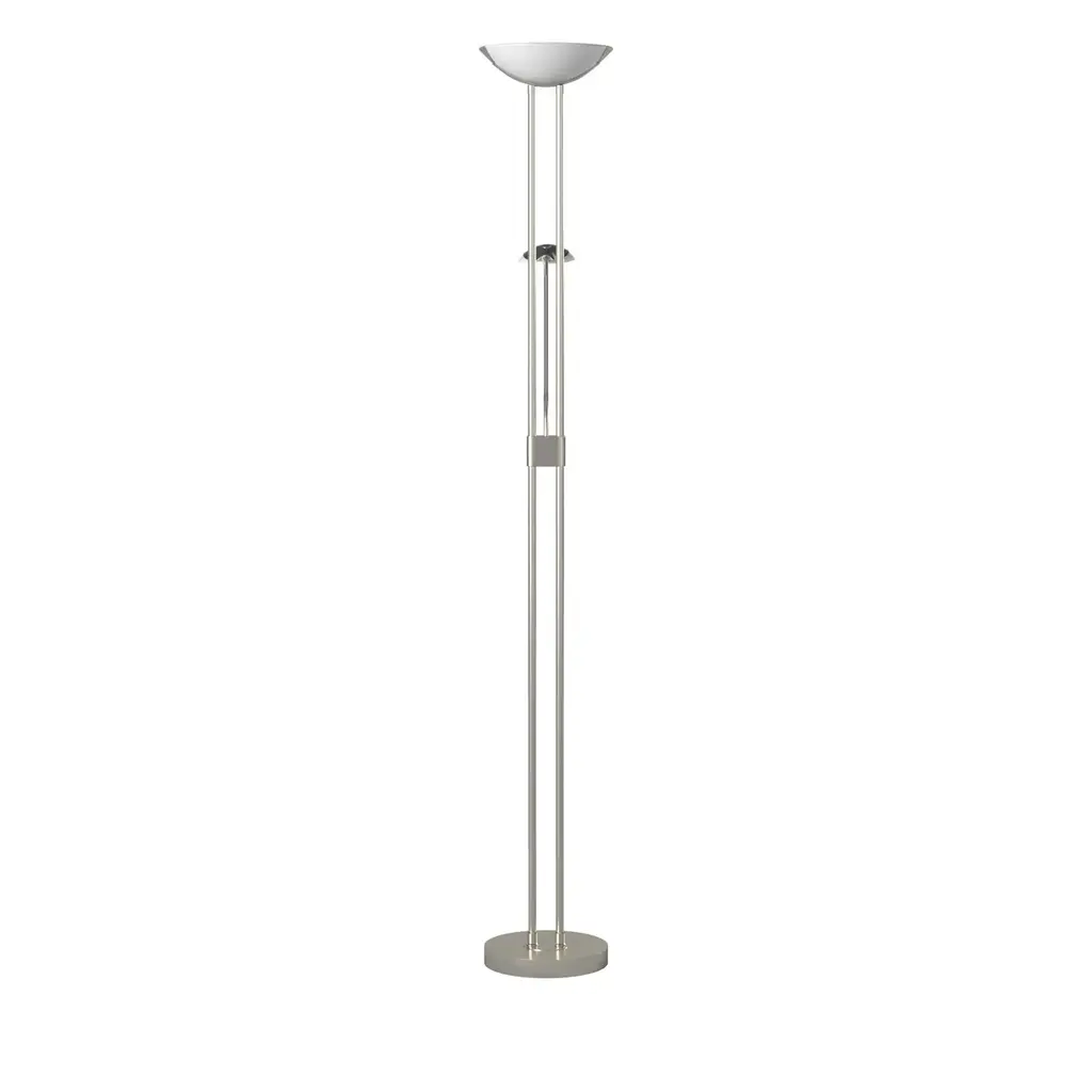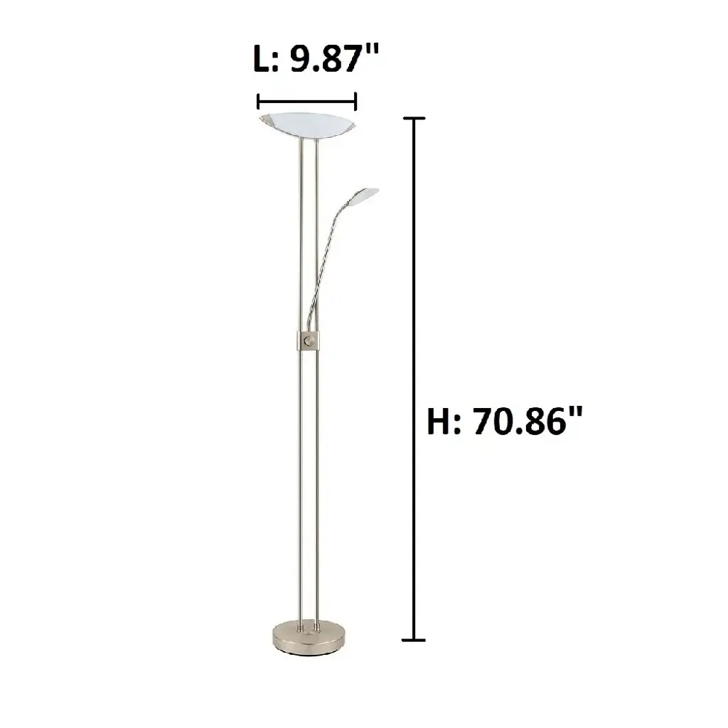 The Baya 1 family offers a modern design in floor lighting. The long linear double bar staff holds the dimmer switch. The arm light is directional for easy access for reading positions.Includes integrated LEDAdjustable reading lampLed dimmableOn/off switch for reading lampMultiple light directionFrame finish: Matte NickelFrame material: SteelShade color: WhiteShade material: GlassSwitch type: Rotary-Dimmer, On/offSwitch location: BaseVoltage: 100-240V,50/60HzDimmableLumens: 1700, 220, CRI: 80, LED Color: 3000 - Warm White, LED Life: 25000Requires three (3) 20 + 3 + 3-watt E12 Candelabra Incandescent base bulb(s) (included)Cord length: 72 inchesPortable base: 9.84 inchesShade dimensions: 2 inches high x 14 inches wide x 9 inches deepDimensions: 70.86 inches high x 9.87 inches wide
