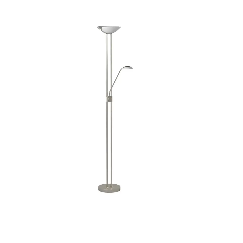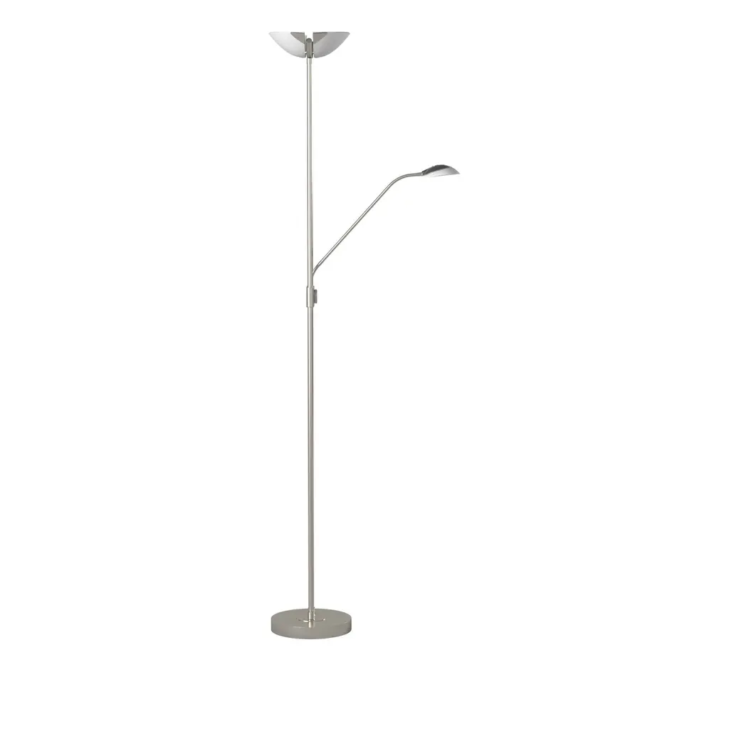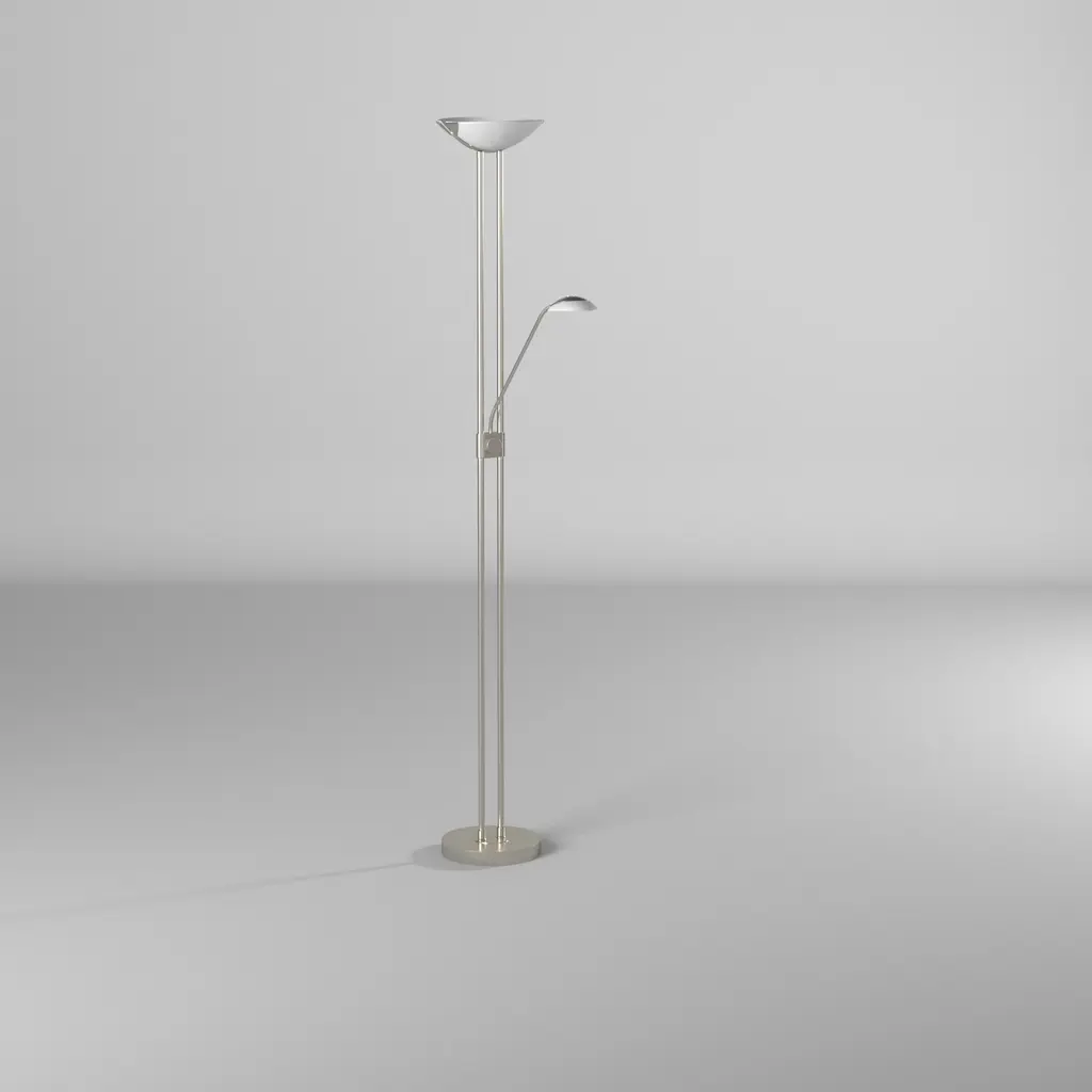 The Baya 1 family offers a modern design in floor lighting. The long linear double bar staff holds the dimmer switch. The arm light is directional for easy access for reading positions.Includes integrated LEDAdjustable reading lampLed dimmableOn/off switch for reading lampMultiple light directionFrame finish: Matte NickelFrame material: SteelShade color: WhiteShade material: GlassSwitch type: Rotary-Dimmer, On/offSwitch location: BaseVoltage: 100-240V,50/60HzDimmableLumens: 1700, 220, CRI: 80, LED Color: 3000 - Warm White, LED Life: 25000Requires three (3) 20 + 3 + 3-watt E12 Candelabra Incandescent base bulb(s) (included)Cord length: 72 inchesPortable base: 9.84 inchesShade dimensions: 2 inches high x 14 inches wide x 9 inches deepDimensions: 70.86 inches high x 9.87 inches wide