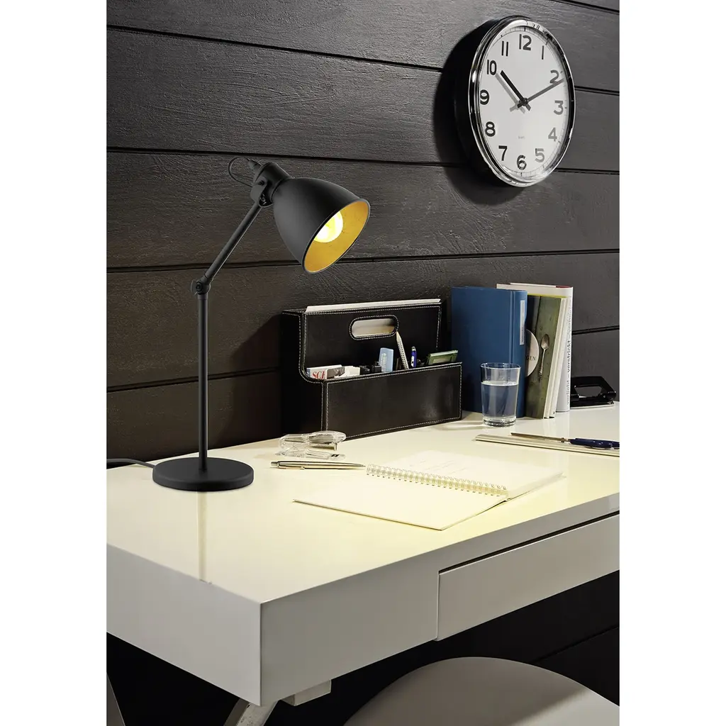 Eglo's Priddy 2 family explores a traditional metal lamp shade to create inspiring, vintage feeling, functional lights. Steel construction of this table light in its black finish and gold shade accent make for a must-have piece in a home office or working space. At a 17 inch height with elbow, this light is very versatile for working or reading under for a modern, minimalistic feeling.Adjustable armAdjustable shadeLED compatibleMounting hardware includedMultiple light directionsFrame finish: BlackFrame material: SteelShade color: Black Exterior Gold InteriorShade material: MetalSwitch type: Rocker/ToggleSwitch location: ShadeVoltage: 120Requires one (1) 40-watt A19 E26 Incandescent base bulb (not included)Portable base: 6.18"DiaCord length: 50" - BlackShade dimensions: 7 inches high x 6 inches wideDimensions: 17 inches high x 6.18 inches wide