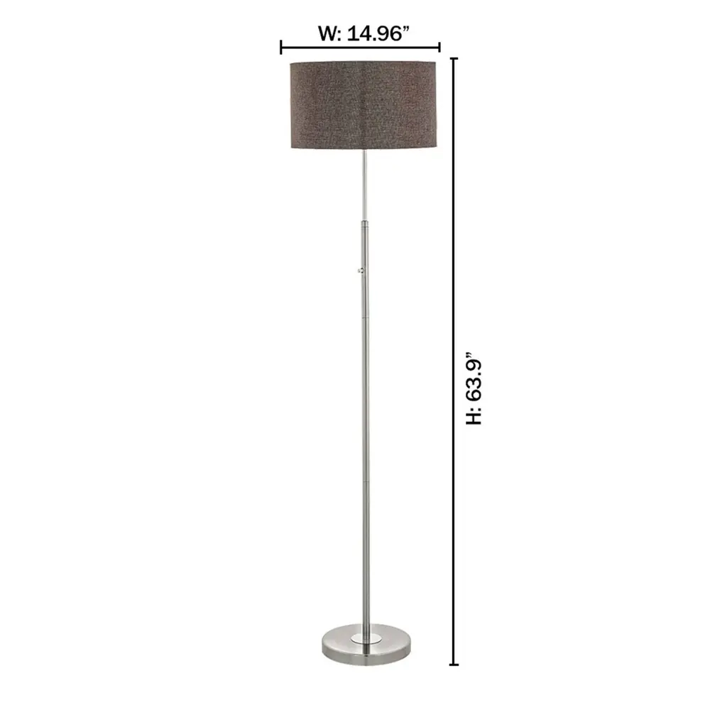 The Eglo, Romao 2, LED floor lamp has a modern form to meet your basic fashion lighting needs. This floor lamp features a satin nickel metal base and brown fabric shade with 2270 lumens of warm white light. Perfect for living room, bedroom, or officeFeaturesMounting hardware includedDown light directionFinish: Satin Nickel/ChromeMaterial: IronShade color: BrownShade material: FabricSwitch type: On/Off & DimmerSwitch location: StemFixture DimmableVoltage: 120Lumens: 2270, CRI: 80 - Warm White, Color temp: 3000, Life expectancy: 50000Requires one (1) 26-watt Integrated LED module (included)Portable base: 9.88"DiaShade dimensions: 8.5 inches high x 14.88 inches wideDimensions: 63.89 inches high x 14.96 inches wide