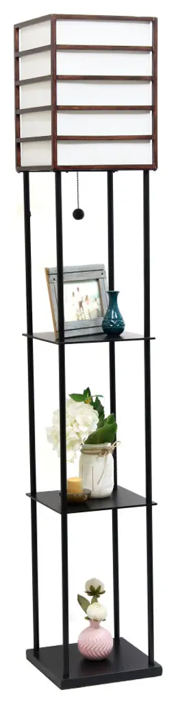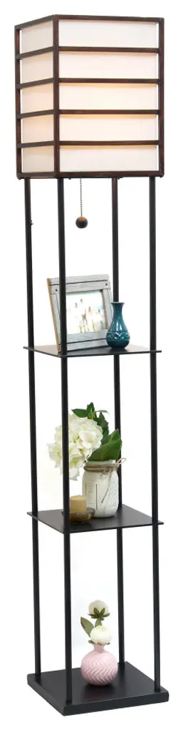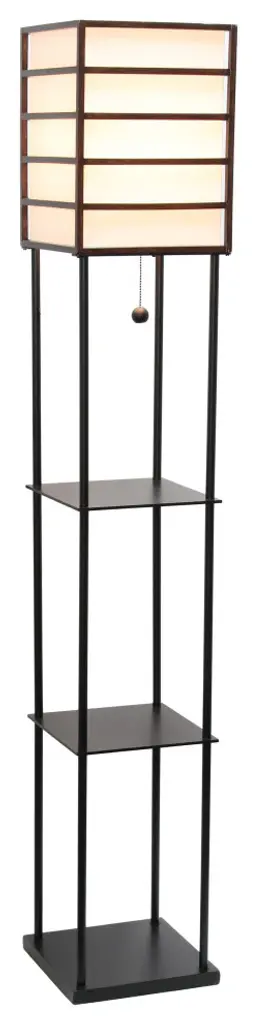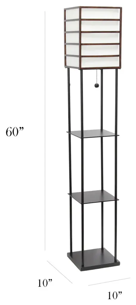 Elegant Designs 1 Light Metal Etagere Floor Lamp, Dark WoodIlluminate your living space in style with our floor shelf lamp with linen shade. The versatile shelves can be used to display photographs and other memorabilia while the linen lamp shade casts a soft, warming light throughout your living space. This lamp adds sophistication and style to any home''s d�cor.3 shelves for storage/display• Assembly requiredEasy pull-chain on/off switch1 x 60W medium type A base bulb required (not included)White linen shadeOverall lamp dimensions: L:10" x W:10" x H:60"Available in additional color/finish options!Finish/Colour :Painted black metal + black shelves brown woodBulbs Included :NoBulb Type :E26 TYPE AShade diameter :10"Number of Lights :1Maximum Wattage :60WShade meterial :FABRICCord Colour :BLACKcord Length :6 FOOTProduct Dimension(L x W x H) :10 x 10 x 60Base Dimensions :L10"XW10"