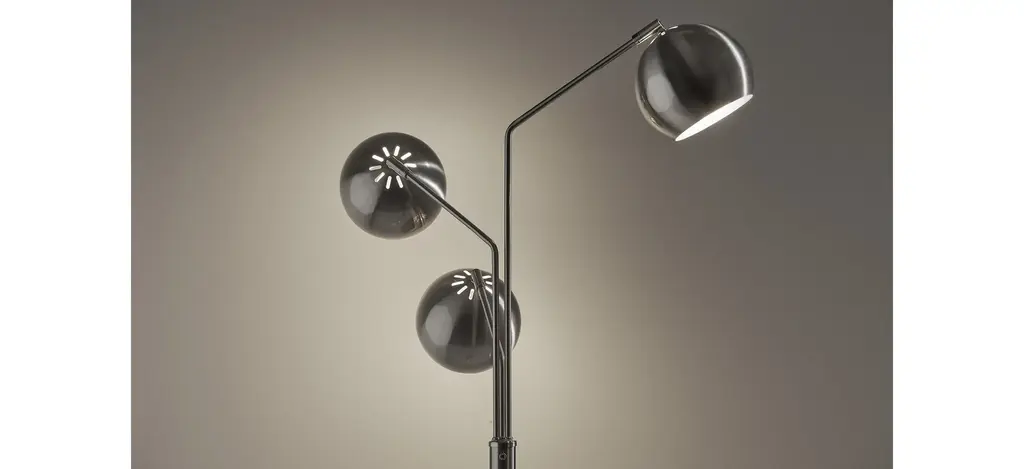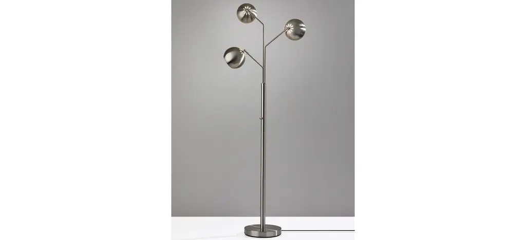Drawing inspiration from mid-century modern designs, this sleek, 3 armed floor lamp features an 6.5" globe shaped shades and slender metal body for a minimalist touch. A brushed finish brings elegance to any space. Place this lamp next to your work space or reading area for a pop of glamour and style. Adjust the arms as well as the shades to direct the light exactly where it is needed. A rotary switch located on the pole controls the light at 4 settings: 1 light on, 2 lights on, 3 lights on, off. This allows for multiple brightness settings to satisfy all lighting needs.