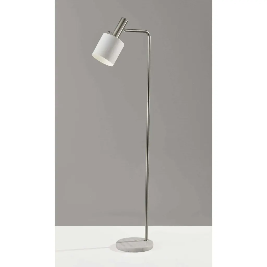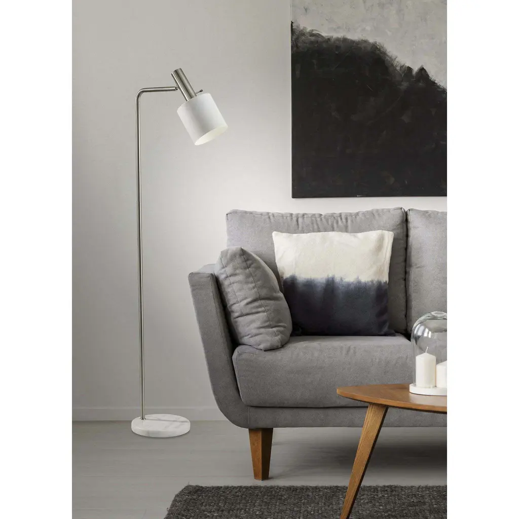 An essential addition to sleek, modern decor, the Emmett Floor Lamp is both functional and stylish. A small footprint allows this piece to fit into various spaces whether it is next to your favorite reading chair, sofa or your home office. An adjustable shade allows for light to be directed where it is needed. A brushed steel and matte white finish is accented by an elegant white marble base.