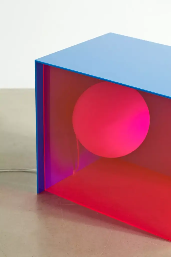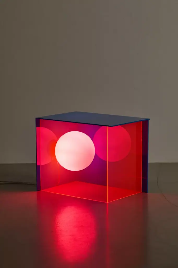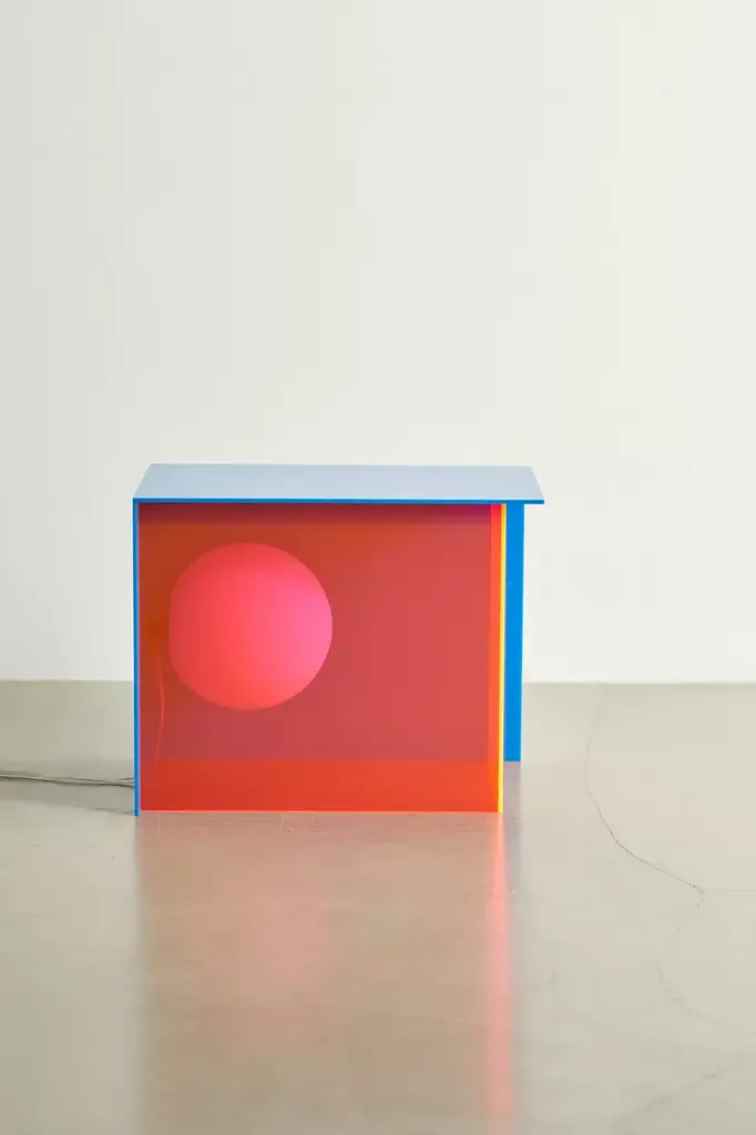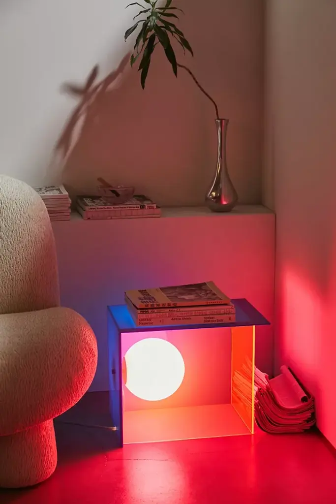 Illuminate your space and create a stunning display of trinkets all-in-one with this side table that doubles as a floor lamp. Made from colorful acrylic with a globe-shaped lamp inside the table. Plugs in to power on. Available exclusively at Urban Outfitters.