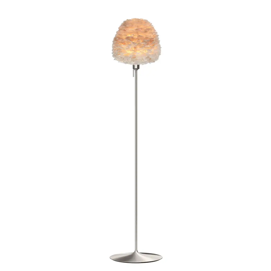 Evias fluffy goose feather shade resembling a beehive makes for a sleek floor lamp, topping a slender, almost invisible stem and a minimal round base. Providing diffuse and warm illumination, designer Soren Ravn Christensens light fits perfectly into any living room, bedroom or hallway. From Copenhagen-based Umages downy Eros series, named for the goddess of the dawn, its available in 2 sizes with the stand in either matte white or black. Sustainably shipped flat-packed, Evia is easily assembled and a wave of a hairdryer is all thats needed to clean the feathered shade.