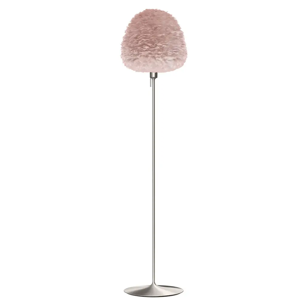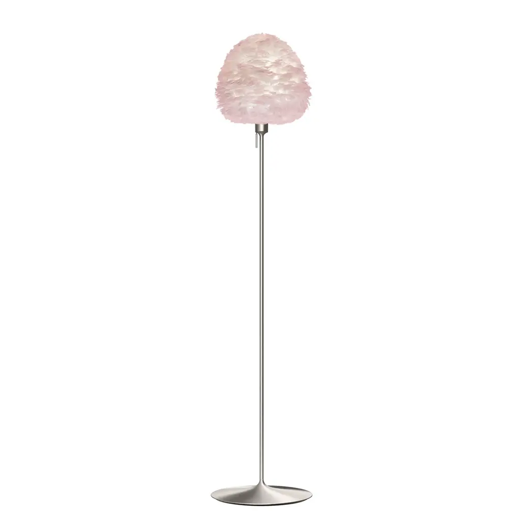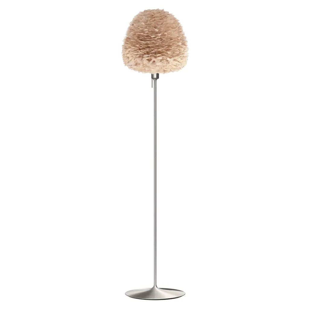 Evias fluffy goose feather shade resembling a beehive makes for a sleek floor lamp, topping a slender, almost invisible stem and a minimal round base. Providing diffuse and warm illumination, designer Soren Ravn Christensens light fits perfectly into any living room, bedroom or hallway. From Copenhagen-based Umages downy Eros series, named for the goddess of the dawn, its available in 2 sizes with the stand in either matte white or black. Sustainably shipped flat-packed, Evia is easily assembled and a wave of a hairdryer is all thats needed to clean the feathered shade.
