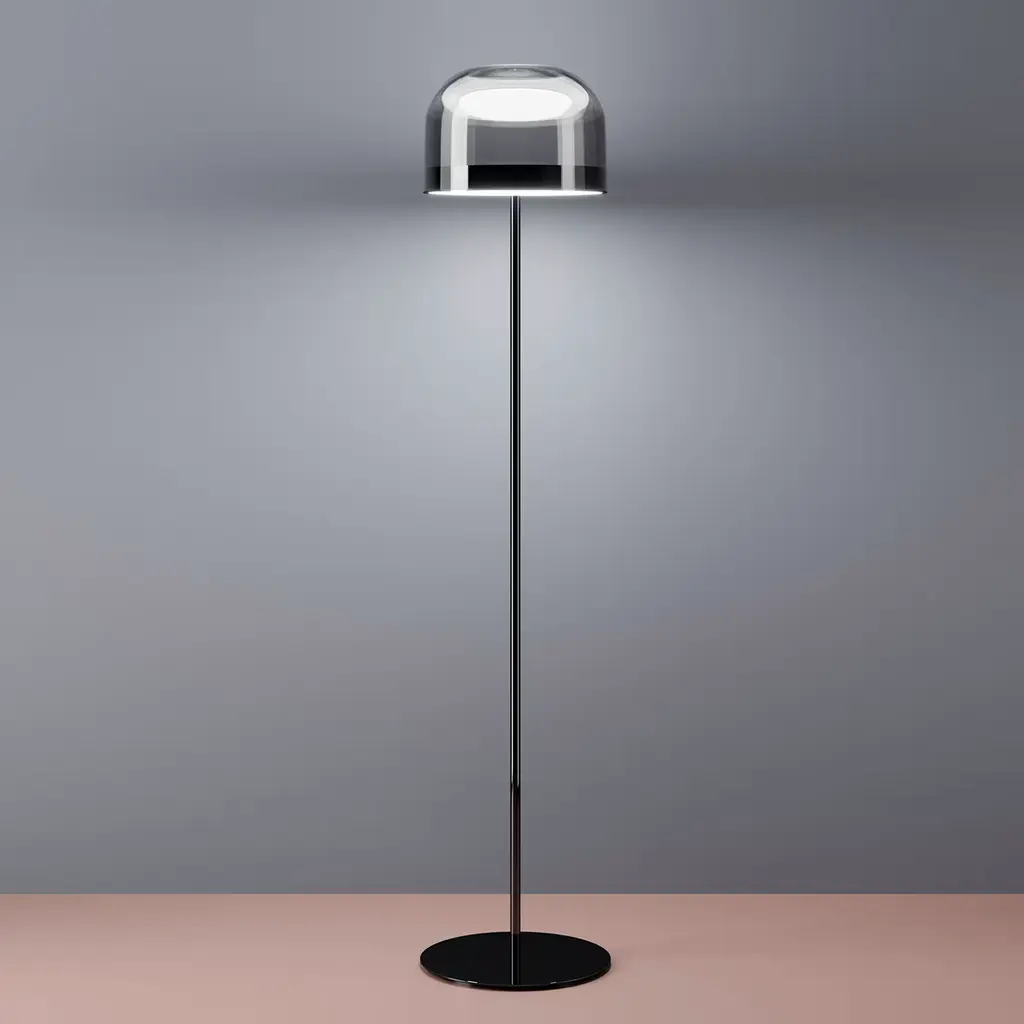 A stunning celebration of pure geometric volumes and minimalist aesthetic, this floor lamp is a modern interpretation of traditional lamps. The metal structure boasts a black chrome finish and supports a stunning, gray-finished glass shade marked with a metal ring at the bottom. The ring hides two dimmable LED strips 40 W (2700K, CRI>90, 2790 Lm) that project their light down and up onto the diffuser for both a direct and indirect lighting effect. This piece is also available in pink glass with copper-finished metal. This item is only wired for 220V and it is sold with an adapter.