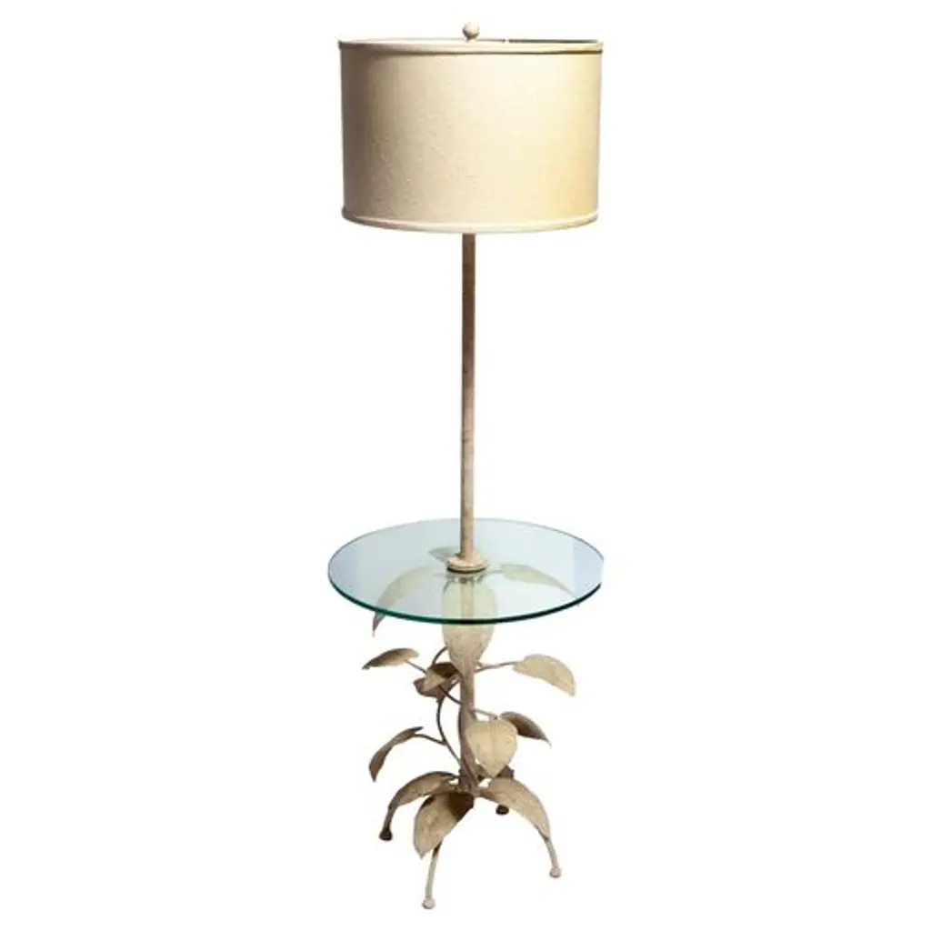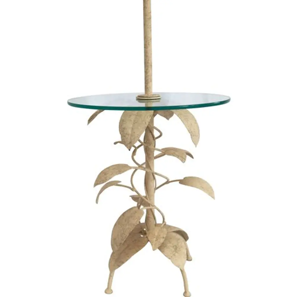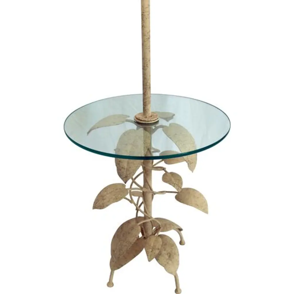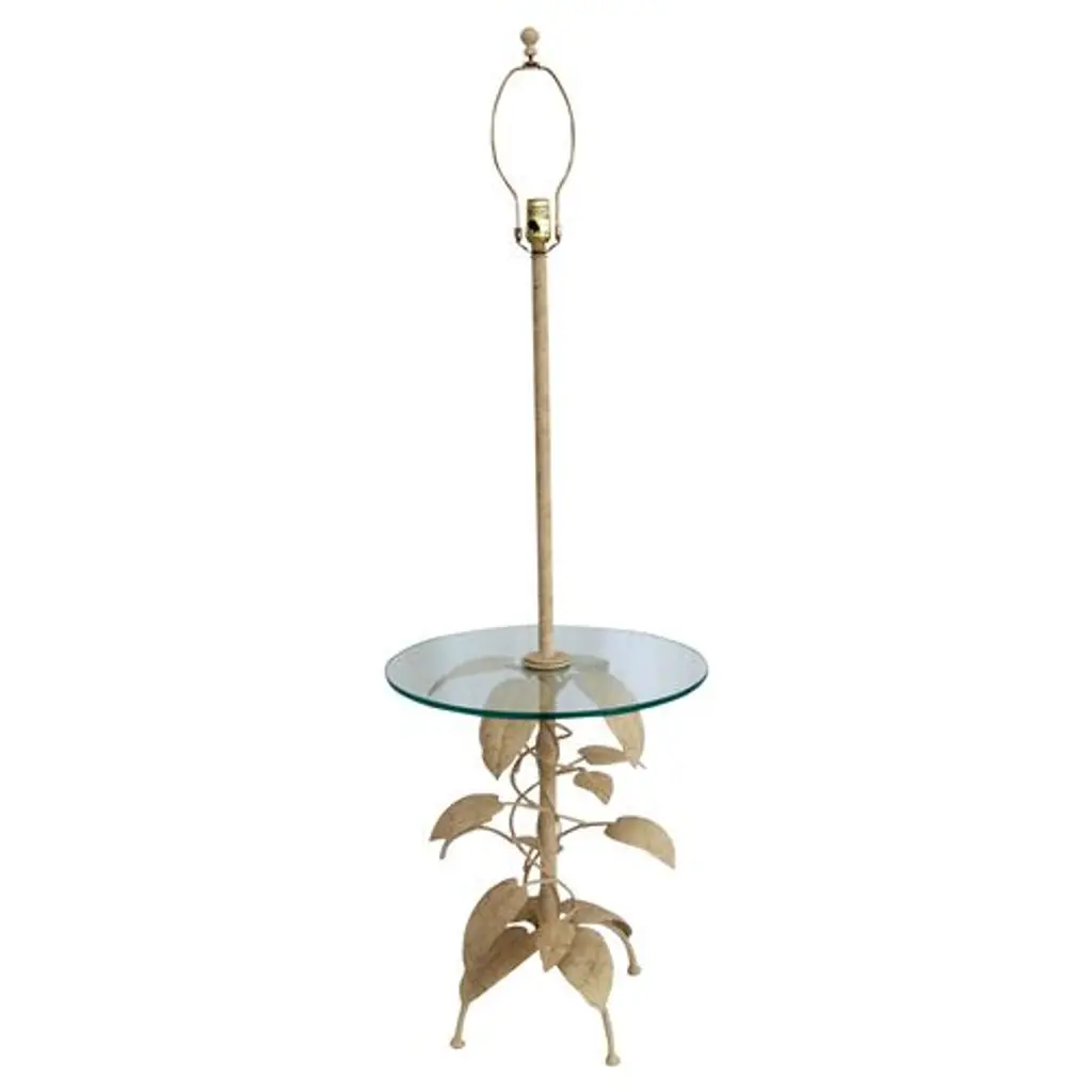 Eric Cooper floor lamp with large leaf plant sculpture and round glass table. In it’s original cream & gold finish Wired in working condition; takes one standard bulb. Linen shade: 10"H x 15"Dia.
