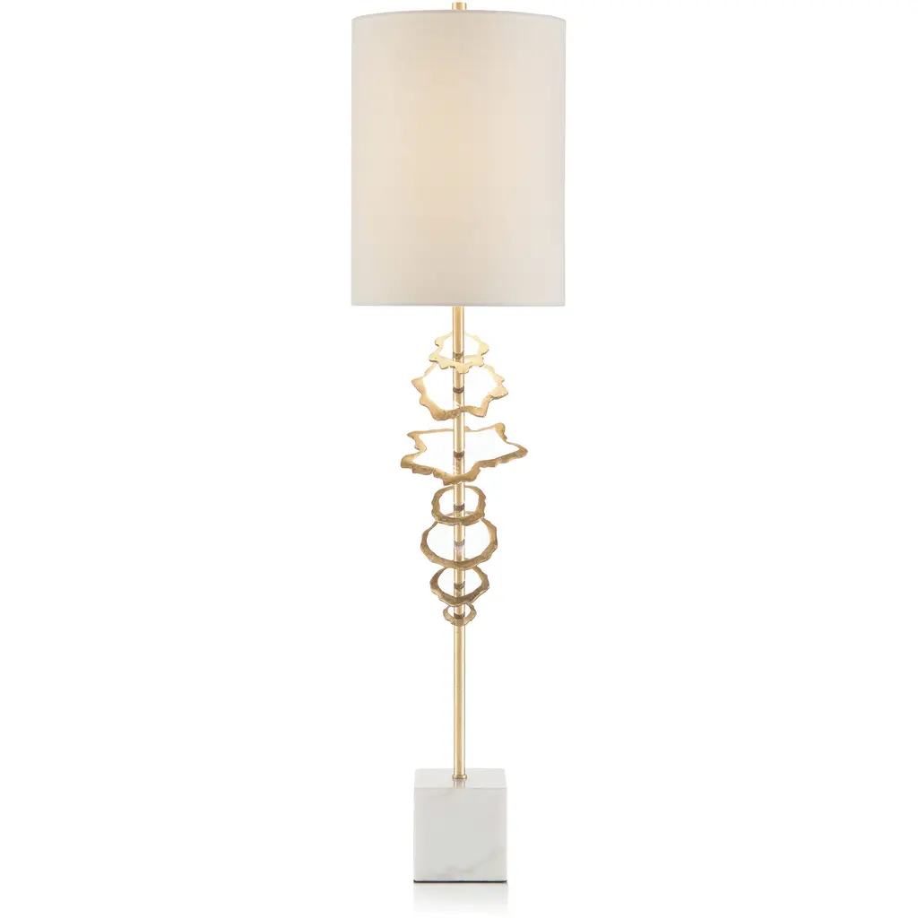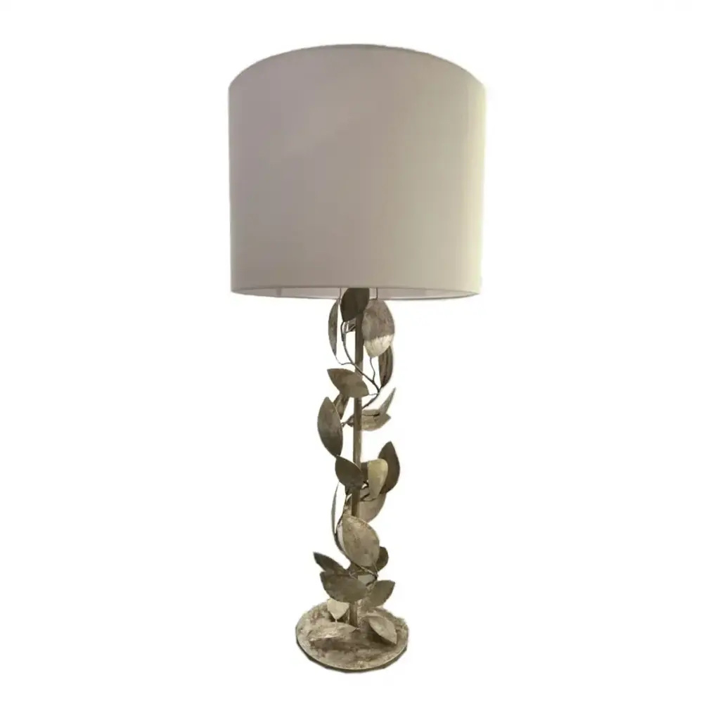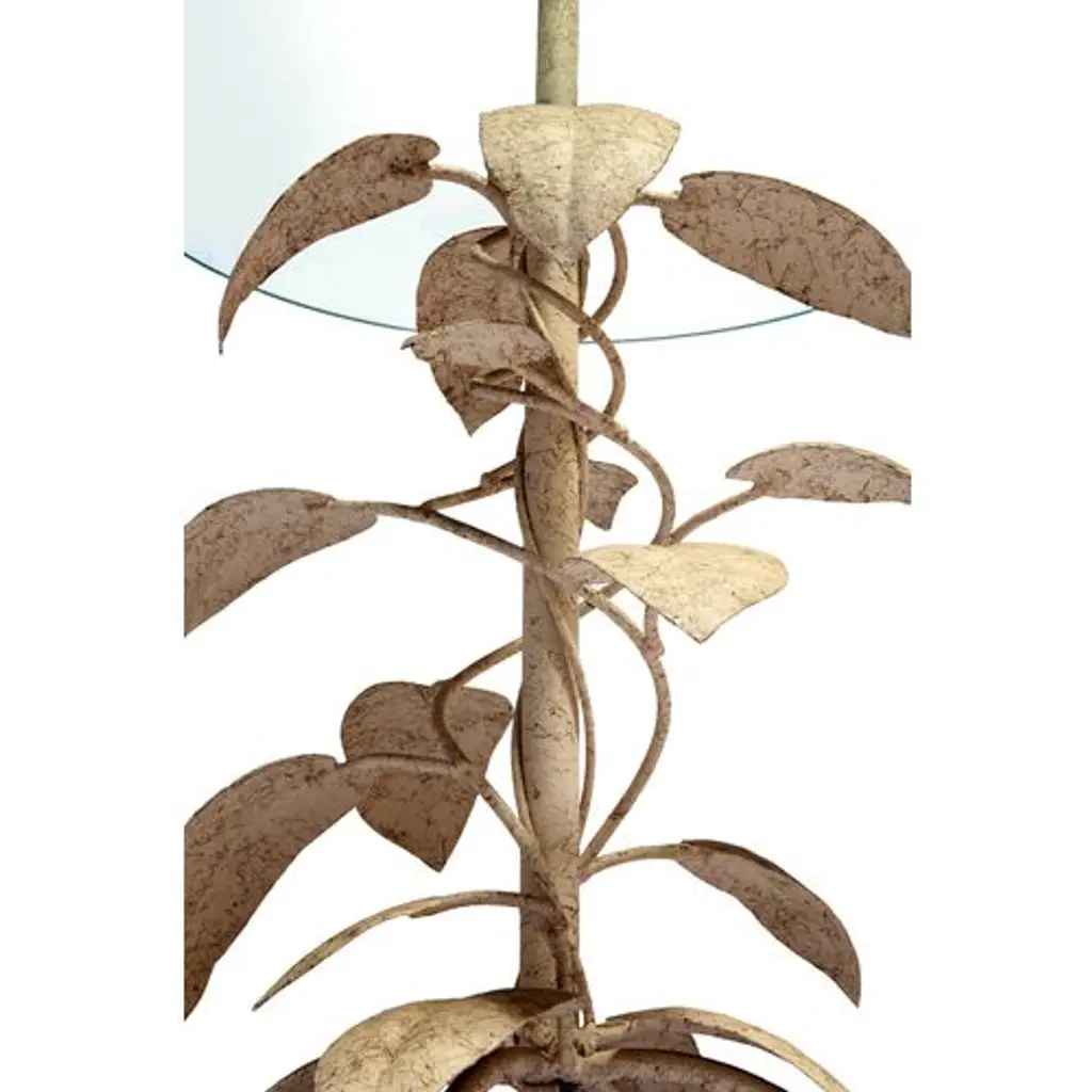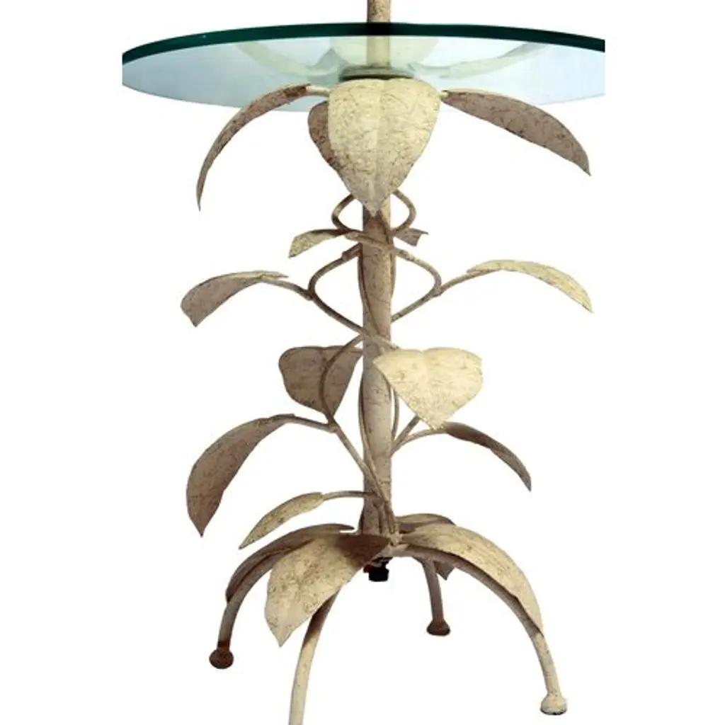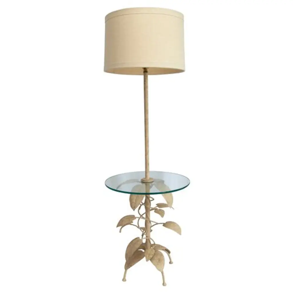 Eric Cooper floor lamp with large leaf plant sculpture and round glass table. In it’s original cream & gold finish Wired in working condition; takes one standard bulb. Linen shade: 10"H x 15"Dia.