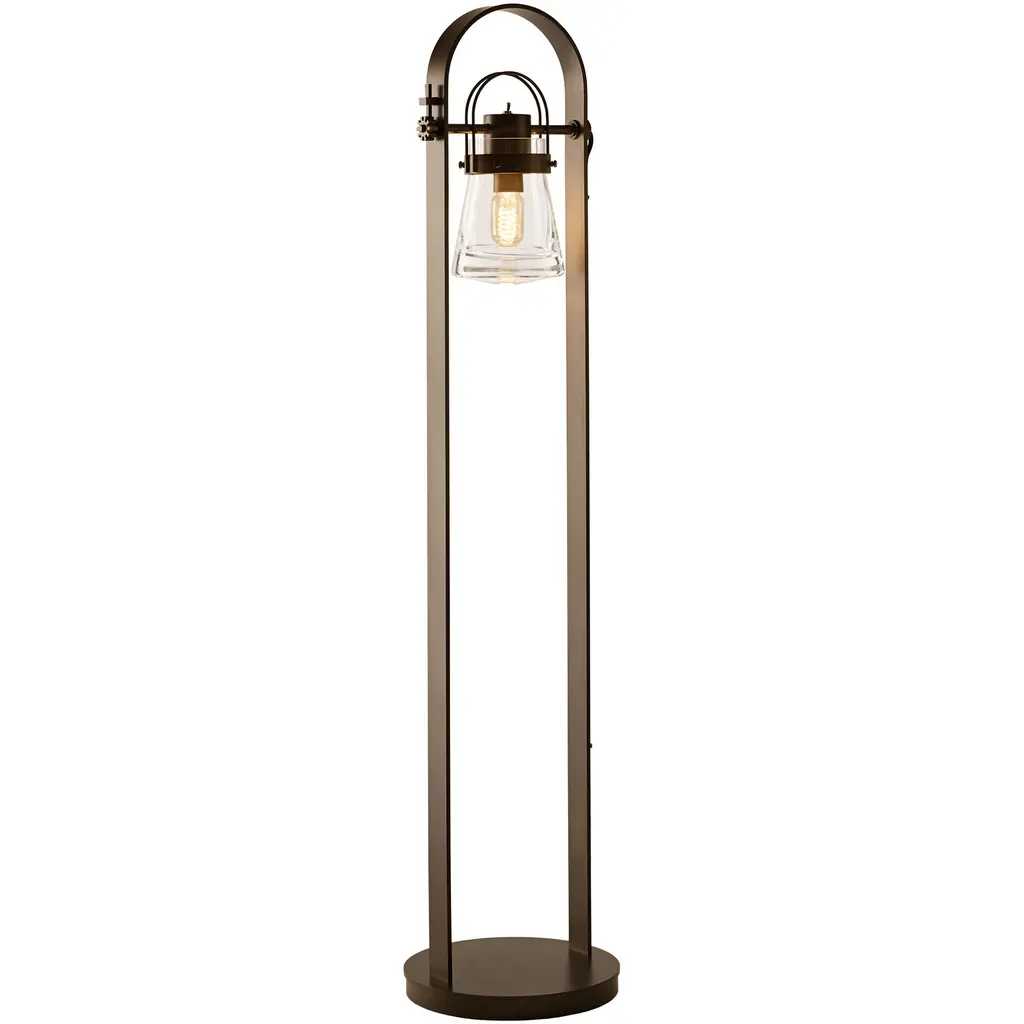 Inspired by the flat-bottomed Erlenmeyer flask, this floor lamp has life beyond the lab. With the handcrafted steel collar encircling the thick blown-glass flask, it's an industrial design with an infused steampunk feel.