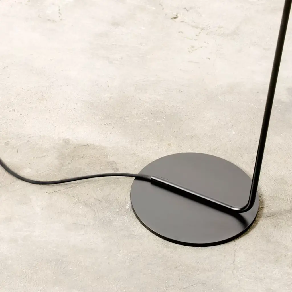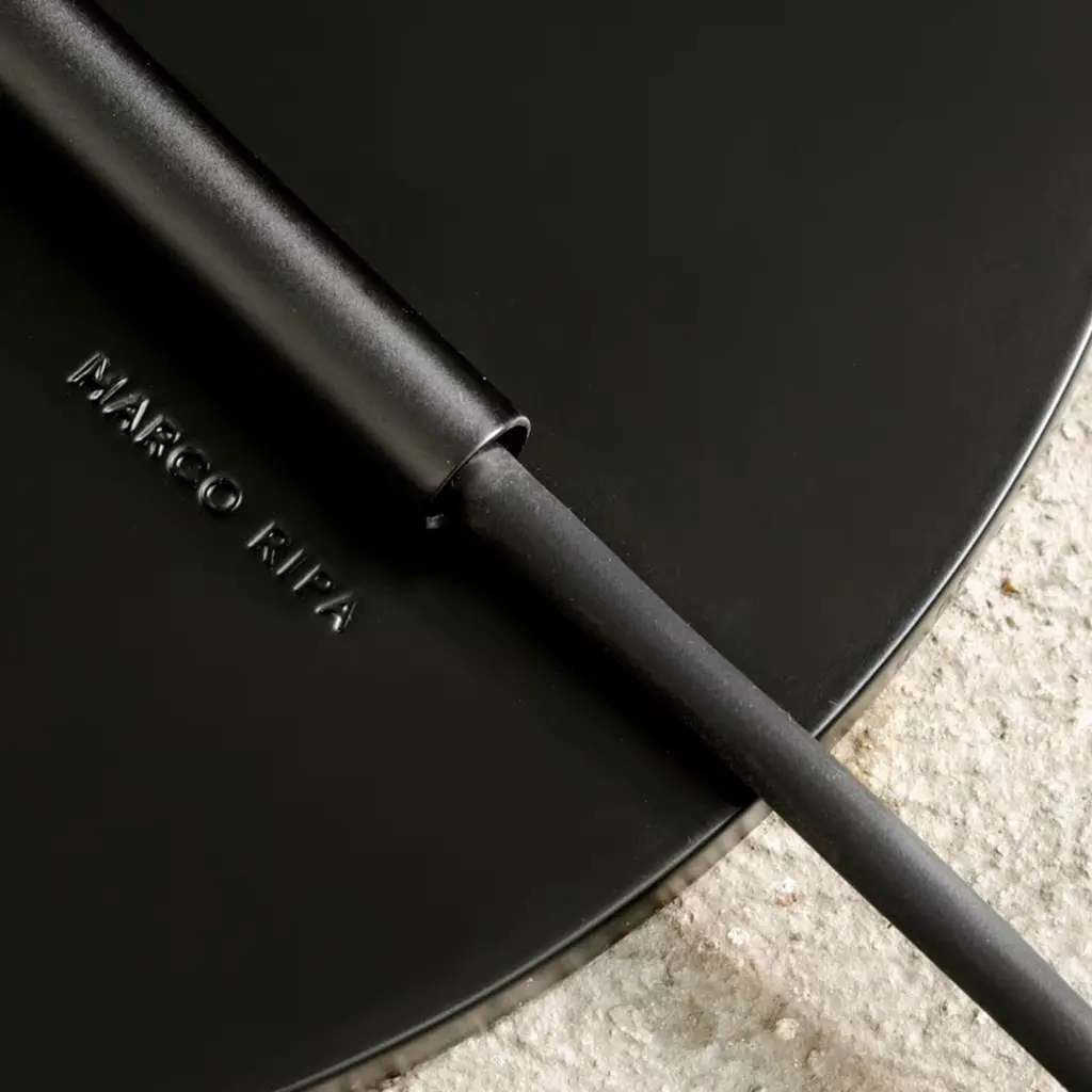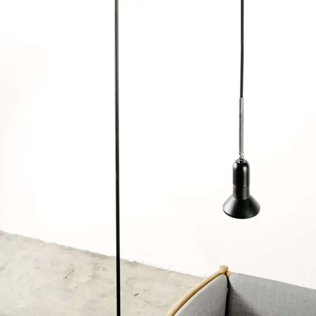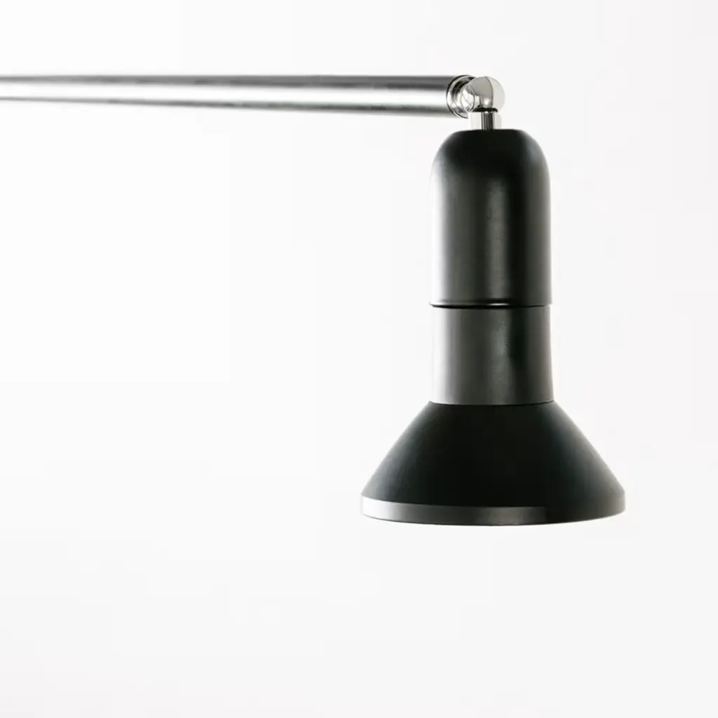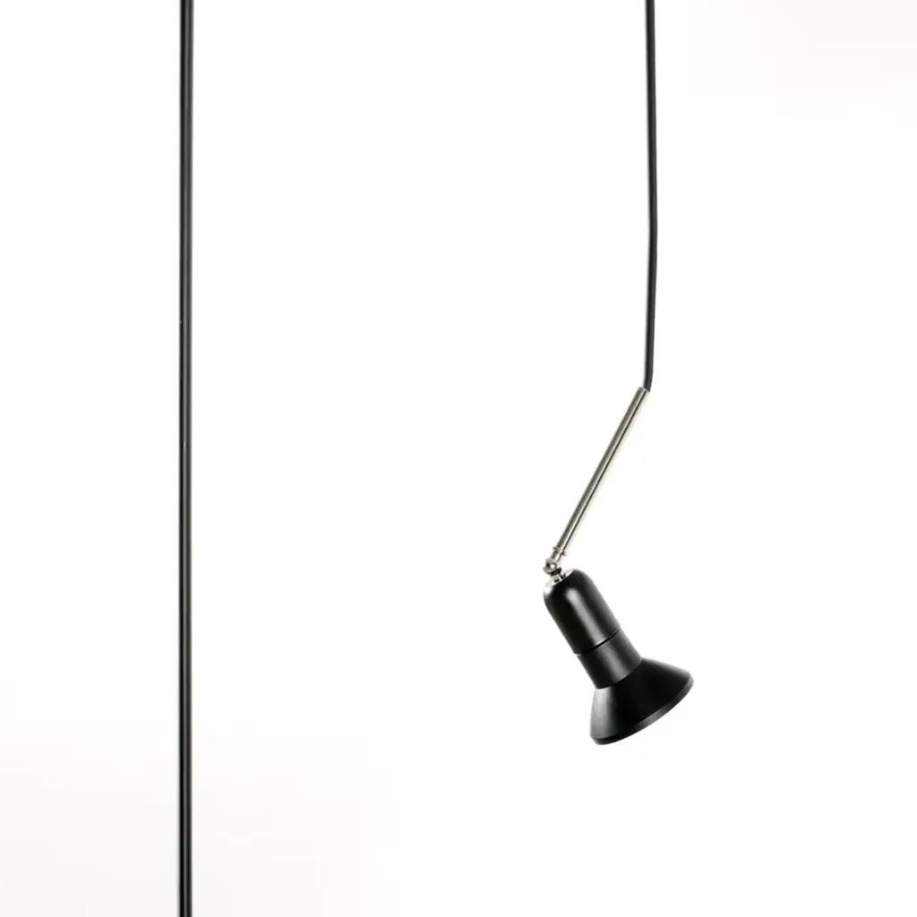 Steadily balanced on a small round base, this lamp epitomizes the intrinsic nature of lighting through a minimalist design of great visual allure perfect for quiet corners or intimate areas of relaxation. Designed by Roberto Cicchinè and created by Marco Ripa, this is formed by bending a single black powder-coated metal tube into a Z shape and topping it with a single direct spotlight that can be rotated and adjusted in any desired angle. The lamp can be transformed into a pendant light by simply pulling the wire into the tubular stem to the chosen height.
