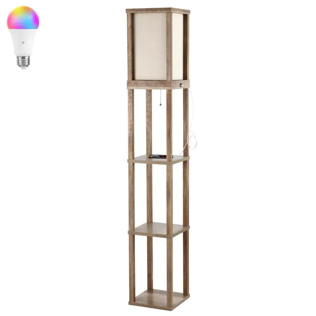 Etagere 63.5" Wooden Led 3-Shelf Floor Lamp With Usb Port, Smart Bulb, Brown