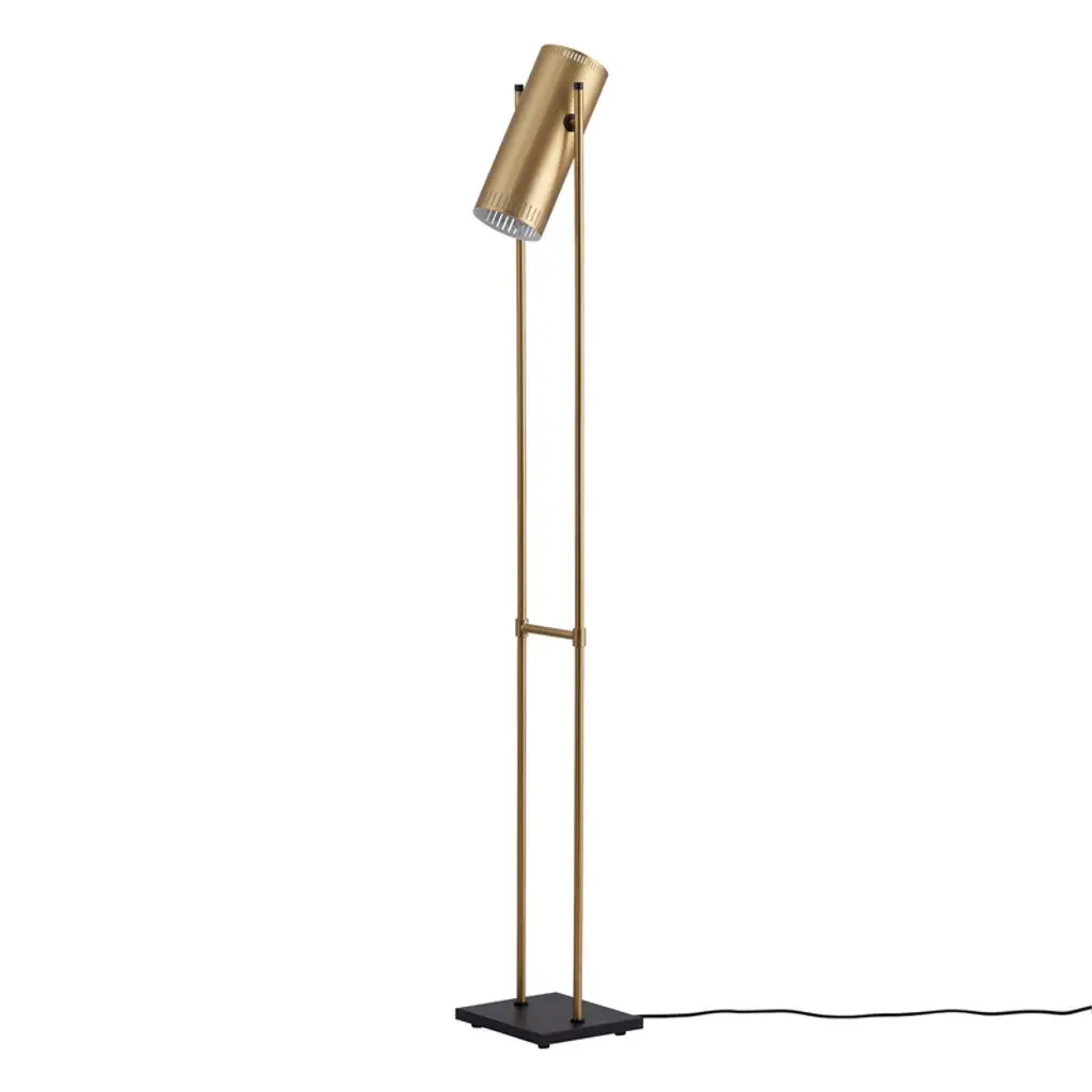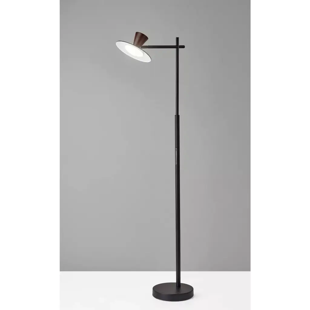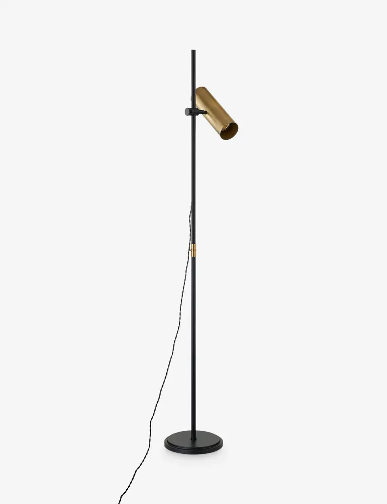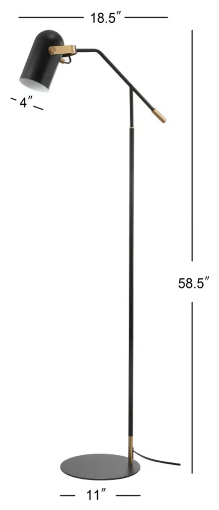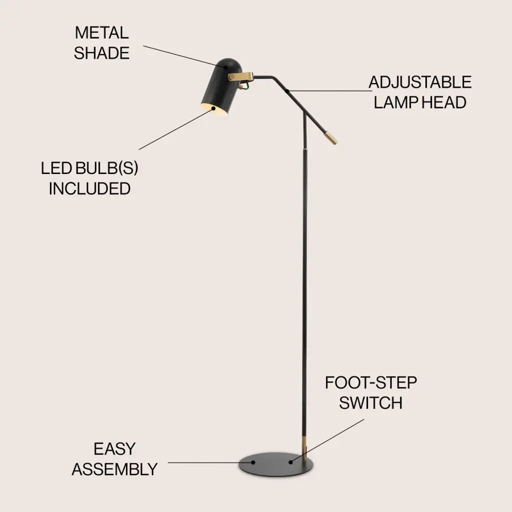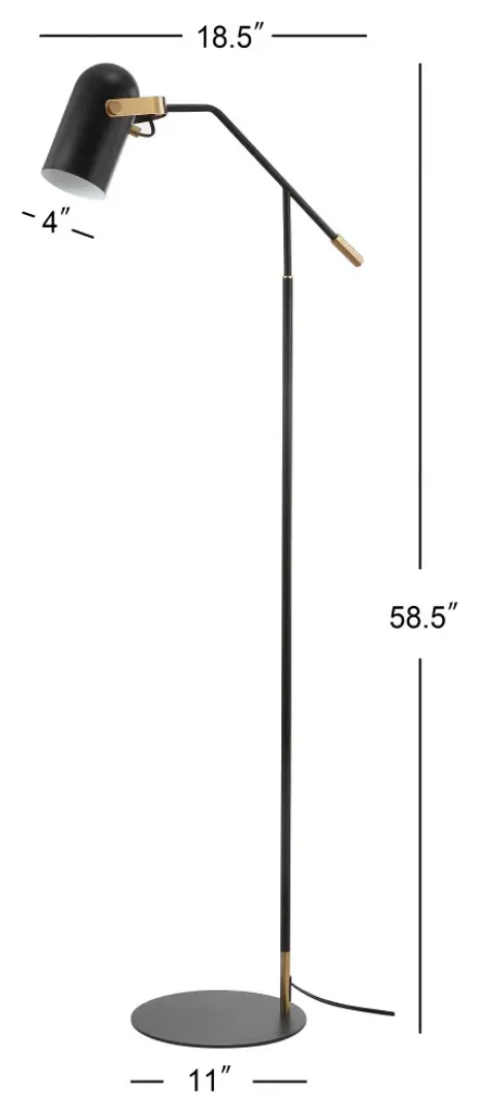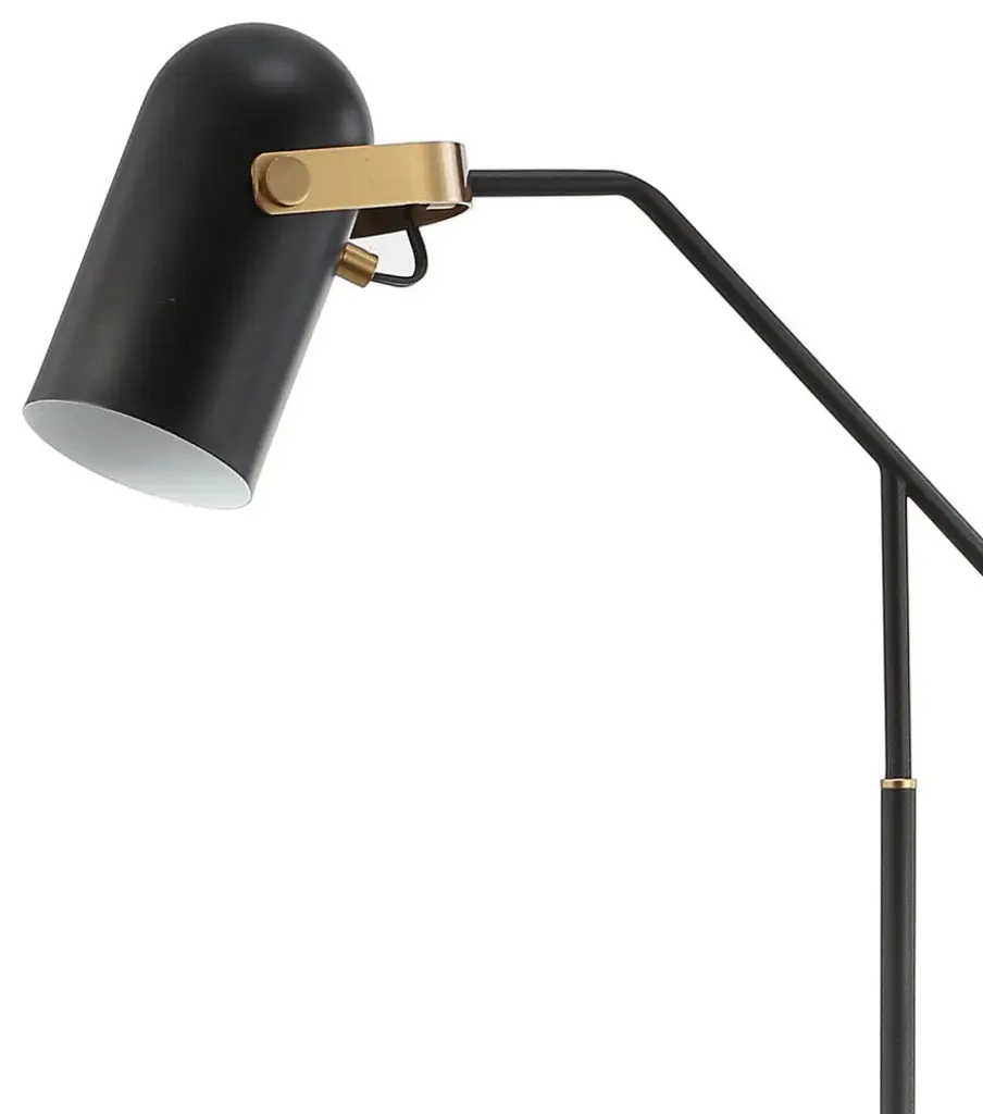 With a levered arm to allow for adjustments to the perfect angle, this task-style floor lamp is a great addition to contemporary or midcentury decor. In matte black with brass fittings, the shape of the metal shade evokes a vintage spotlight -- a fitting tribute for a stage-stealing style. With a sleek base that easily slides under a sofa or chair, you''ll be able to pull this piece up close for maximum reading light. Features:• Ideally for a reading nook, the angle of the shade is designed to give focused light without glare • On-off foot-step switch• Eco-friendly 9W LED bulb included• Takes one bulb and compatible with any 9W LED or 40W TYPE "A" or 13W CFL• UL Listed • 0• Color: Black/Brass Gold• Body Material: Metal• Base Material: Metal• Finial Material: -• Finial Color: -• Harp Color: -• Includes: One (1) lamp(s)• Minor Assembly RequiredDimensions:• Lamp: 58.5 inches high x 18.5 inches wide x 11 inches deep• Shade: 7.25 inches high x 4 inches wide x 4 inches deepAbout us:You see a lamp.We see a decorative work of art.A perfectly curved shade casts a dramatic shadow on a floor. A silk cord you never want to hide. LED lightbulbs: as easy on the environment as they are on the eyes. The JONATHAN Y Lighting collection considers every detail from impeccably sourced materials to designer styling. And our prices are so attractive, we''ve transformed a functional necessity into a fashion accessory.JONATHAN Y Lighting - a fashion revolution in home decor.