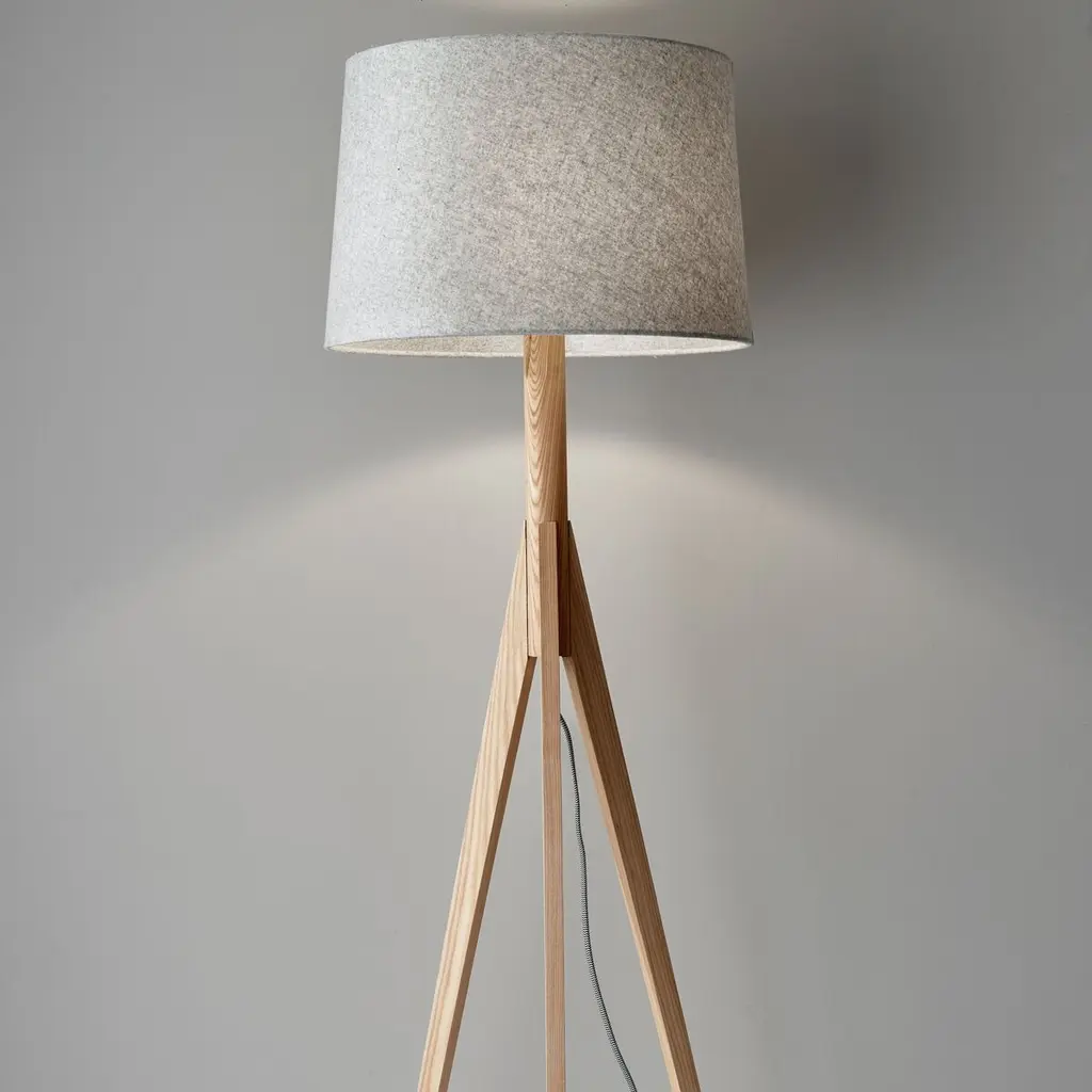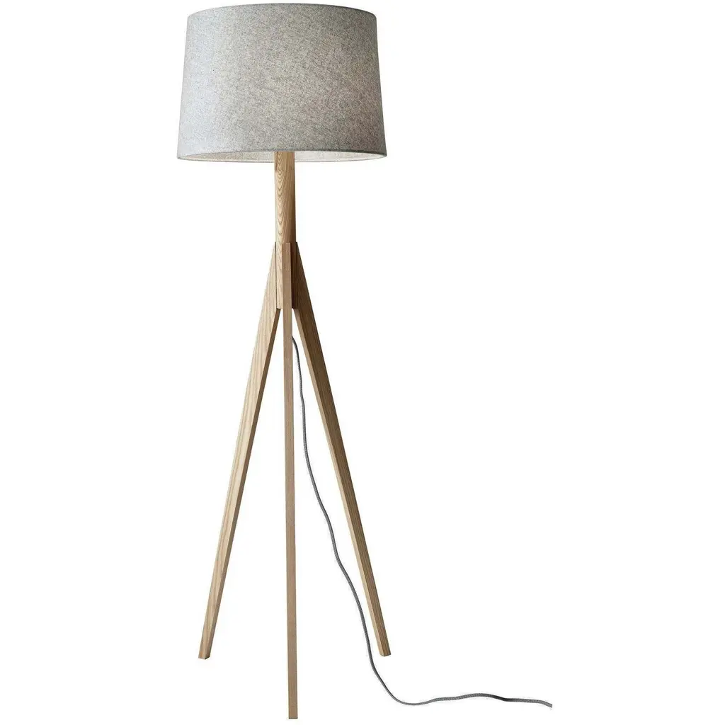 Showcasing an elegant medley of textures, this modern tripod design pairs a richly figured ash base and gray felt shade with a black-and-white fabric-covered cord.