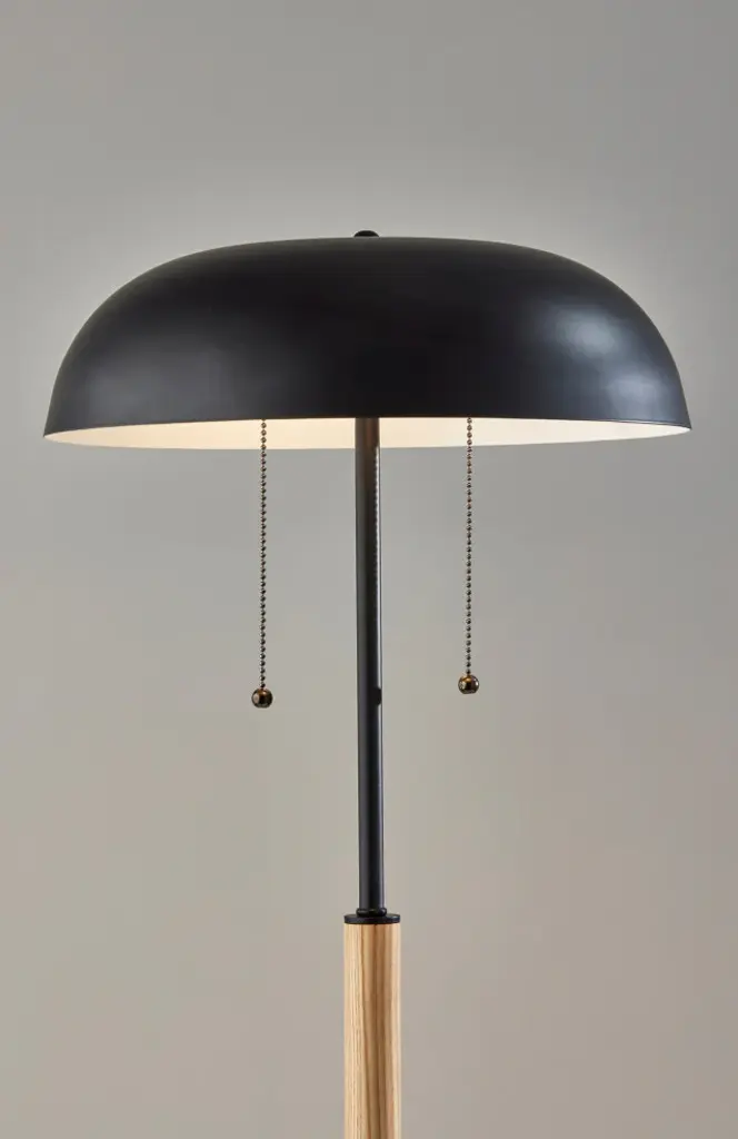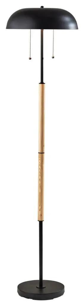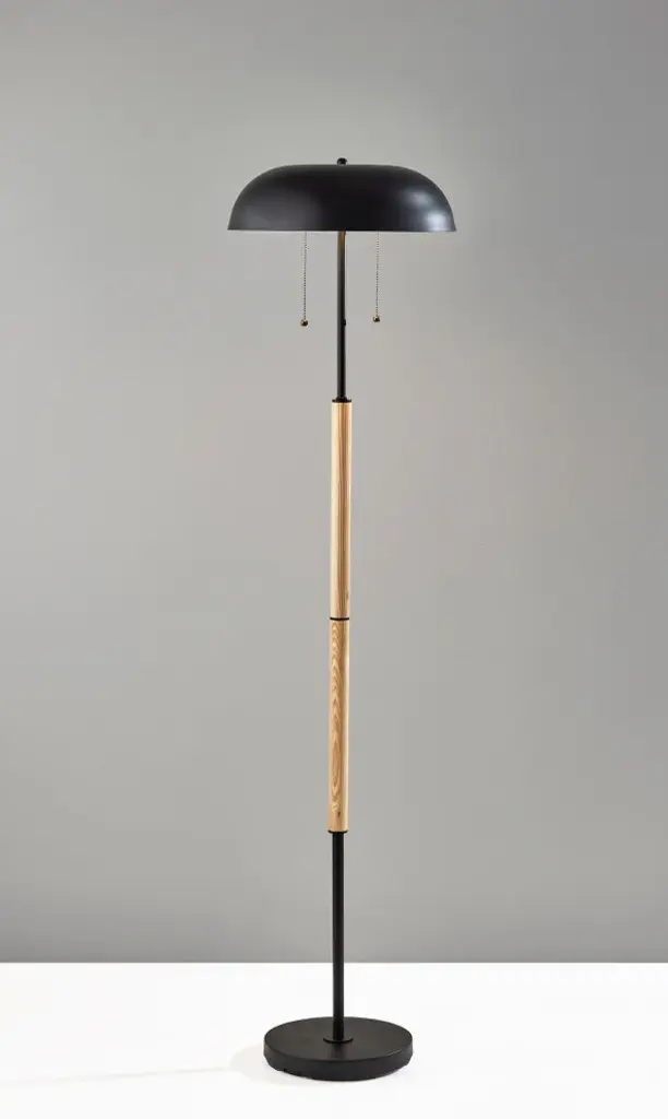 With an inspired mix of materials and colors and a silhouette of soft curves, the Everett floor lamp is equally at home in industrial, farmhouse, or transitional spaces. Primarily crafted of black metal from the round base to the vintage domed shade, the lamp features two contrasting natural wood accent pieces along the stem for a pop of visual appeal. The large, 14.5" diameter black metal dome shade directs the light from two 40W bulbs downward, making the lamp an ideal addition beside reading chairs or other furniture. The lamp is easily operated by double pull chain switches made of black metal. Complete your décor with the Everett table lamp.At 58.5" tall and 14.5" deep, the lamp offers a narrow footprint that is ideal beside chairs, couches, and love seats.Mix of natural and black metal materials complement industrial, farmhouse, or transitional décor.The cylindrical natural wood accent pieces add contrast to the black metal construction.The domed light shade silhouette adds vintage appeal.The Everett style is also available as a table lamp.E26 40W X 2 TYPE A BULB (NOT INCLUDED)