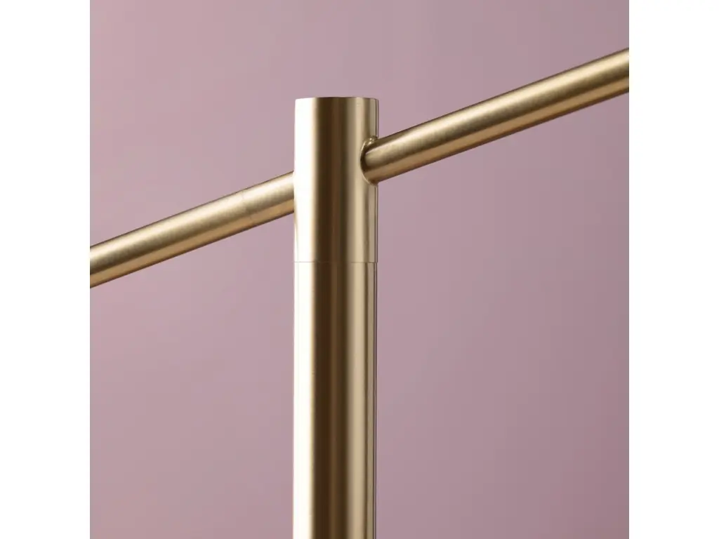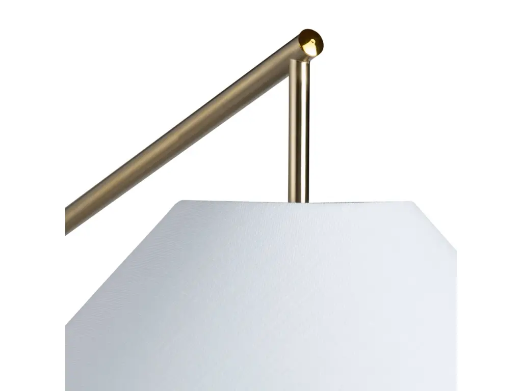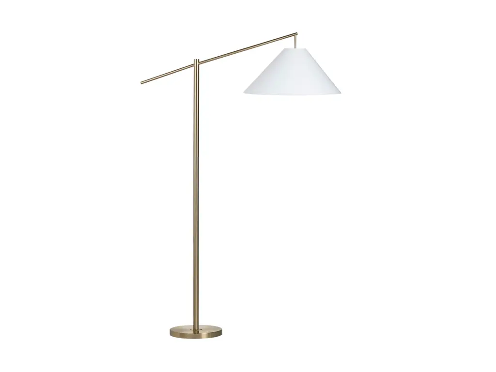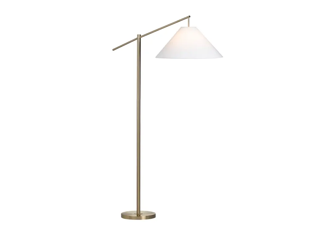 This sleek floor lamp brings modern style and functionality to any room. Crafted from durable steel, its gold metal body and sturdy round base offer a minimalist, contemporary look. The extended horizontal arm adds a unique, architectural touch, complemented by a crisp white tapered drum shade made of linen for soft, diffused light. Featuring an inline on/off switch on the 6-foot clear cord, this lamp is easy to use and works with a 100W bulb (not included), perfect for task or ambient lighting.