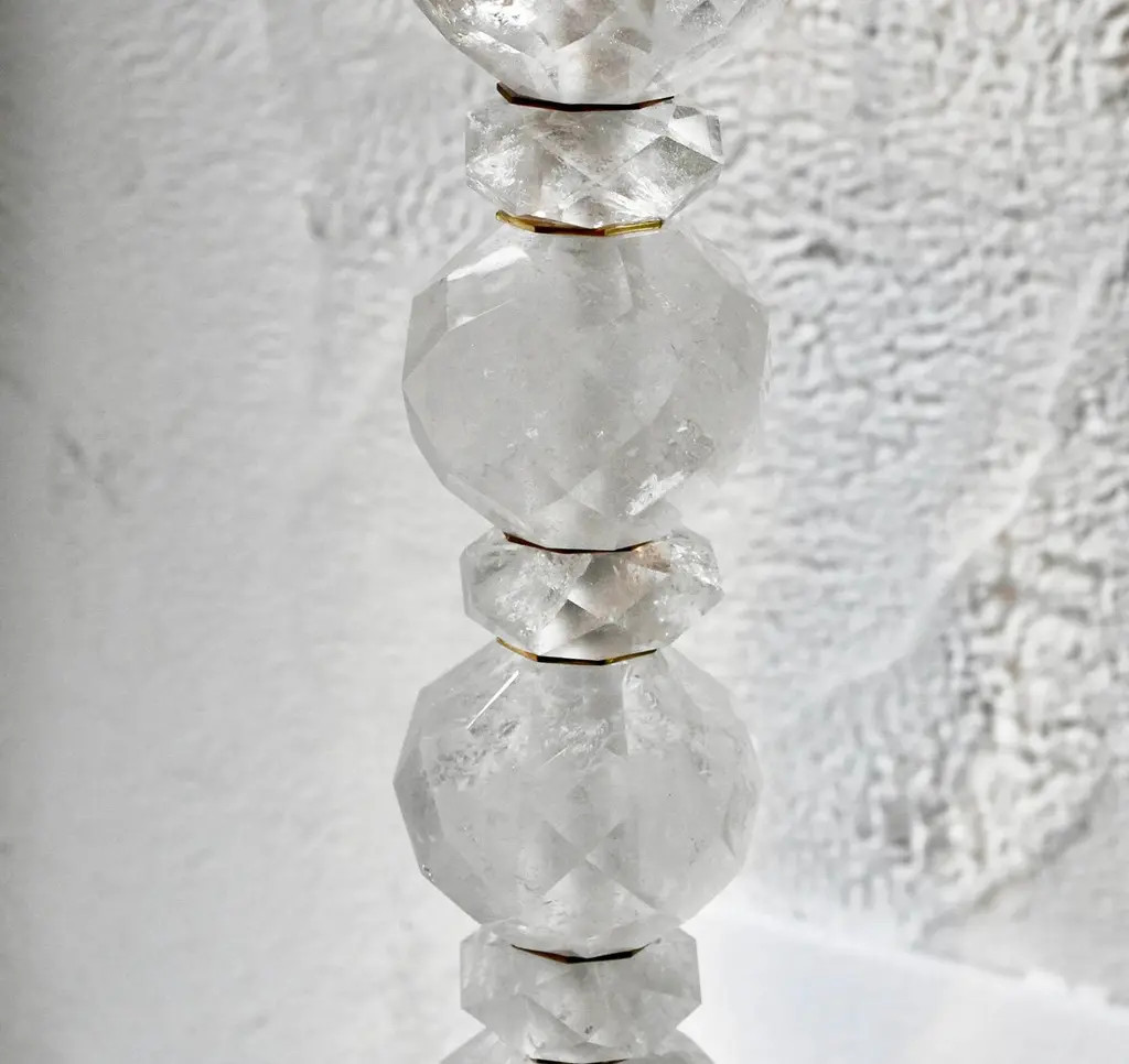 Finely carved facet globe rock crystal lamp with polish brass decoration. Created by Phoenix Gallery, NYC.To the top of the rock crystal is 56 in, overall height is 69 in.(Lampshade not included).Custom size and metal finish upon request.