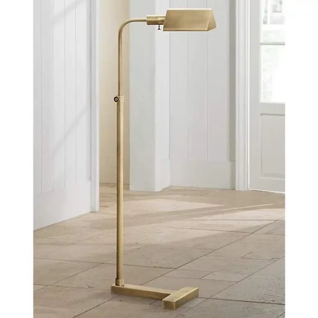 A unique design updates a traditional task light. The Fairfax Pharmacy Floor Lamp from House of Troy brings versatility, function, and style into modern living rooms, bedrooms, or office of any decor or established motif. A distinctive T-shaped base lends this product unwavering stability to support the stem, arm, and shade. The height of the product may be adjusted, and the shade can be rotated up and down, so you can position the light to be directed at the ideal angle for whatever the task at hand requires.