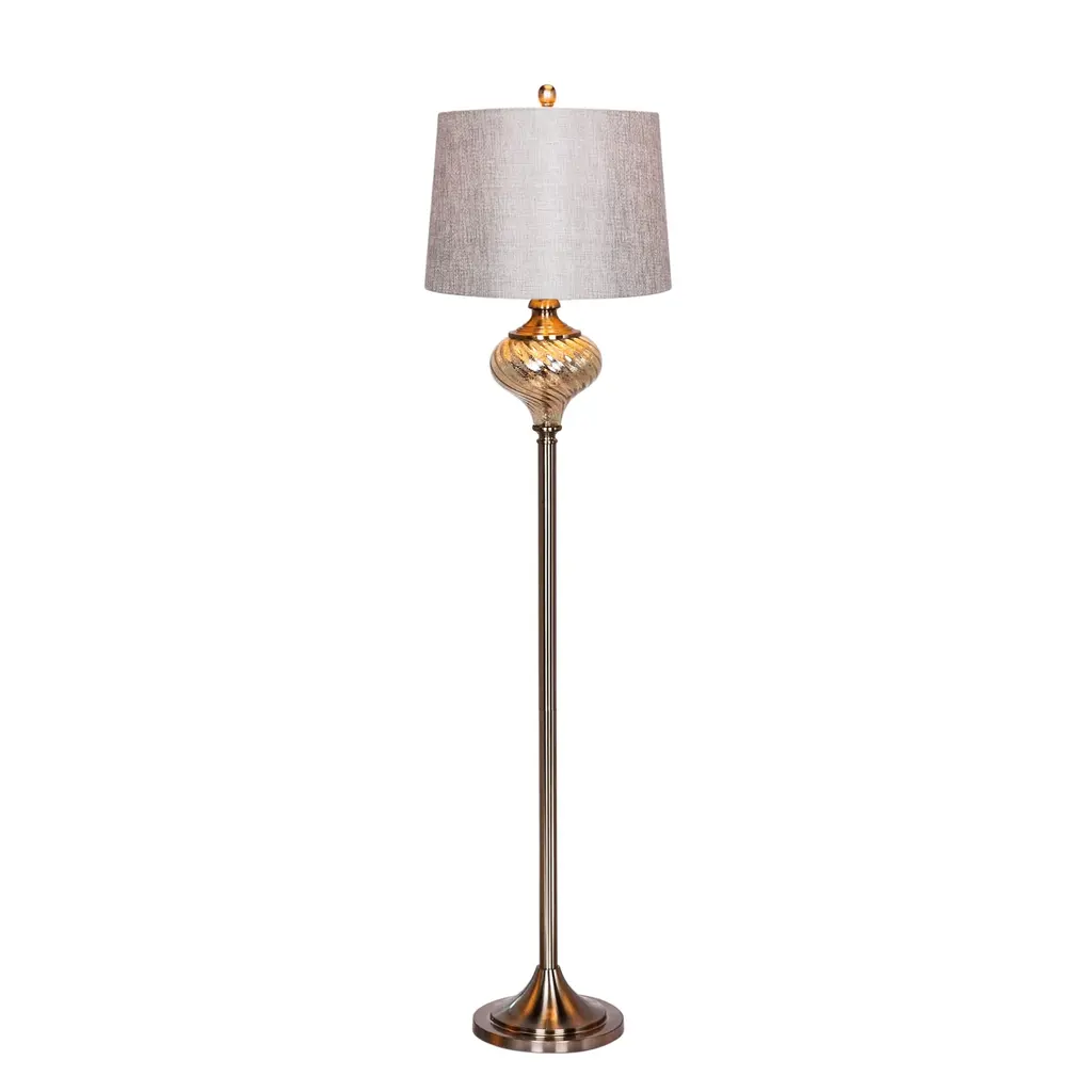 Fangio Lighting's 1595 61.5 in. Brushed Steel & Swirled Mercury Glass Font Floor Lamp is sure to instantly charm. Attention to detail can be found in the striking look and stunning design that will add a subtle Modern flare to your favorite space. The Brushed Steel finish is among the most desired in homes today! Lamp includes a designer shade made in a décor friendly hue of Grey. Light comes complete with an easy to use 3-Way switch. This item takes 1 bulb with a maximum wattage of 150 (Not Included.) Lamp is UL and CSA Listed. Showcase your discerning tastes brilliantly with this item. The stylized, Swirled Glass Font look possesses its own presence while illuminating your exquisite decorating tastes. If you enjoy the graceful lines of Modern designs, this is the lamp for you! Bring this item home! You will be glad you did!