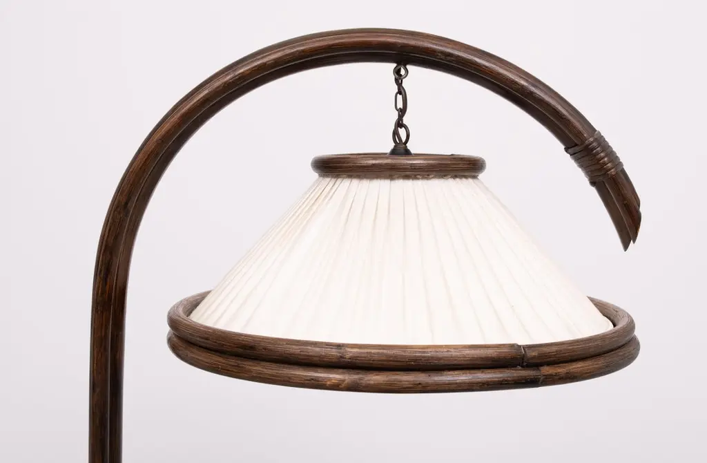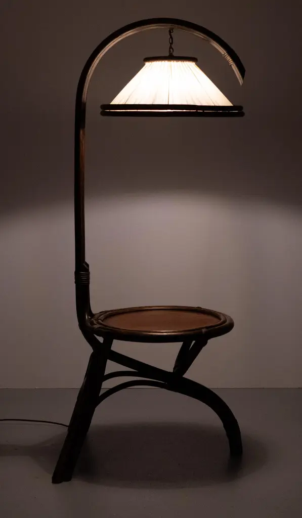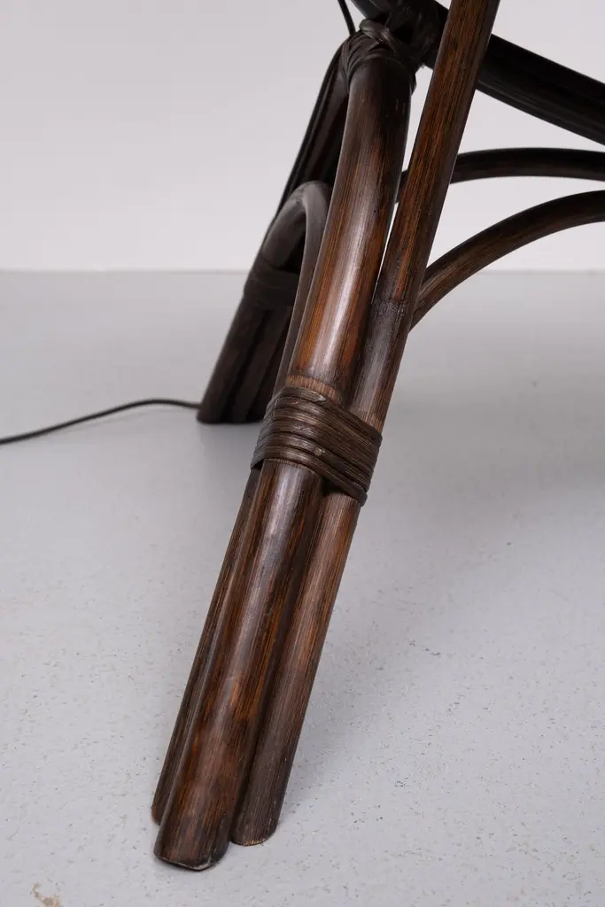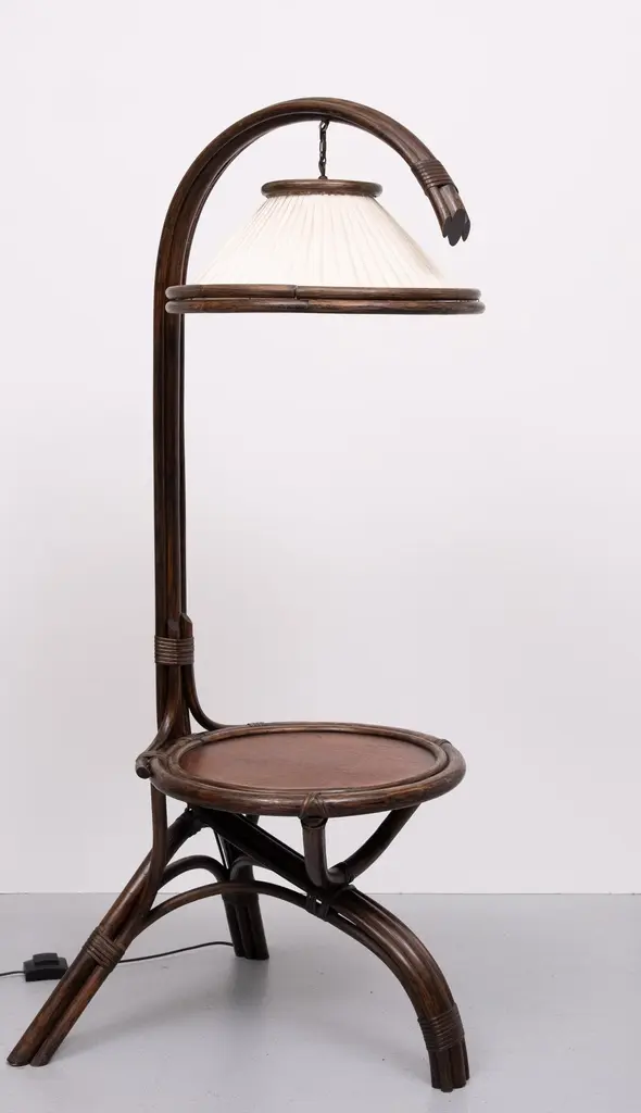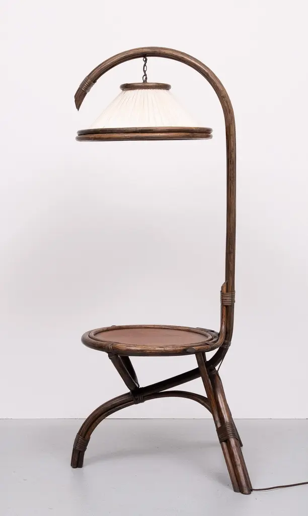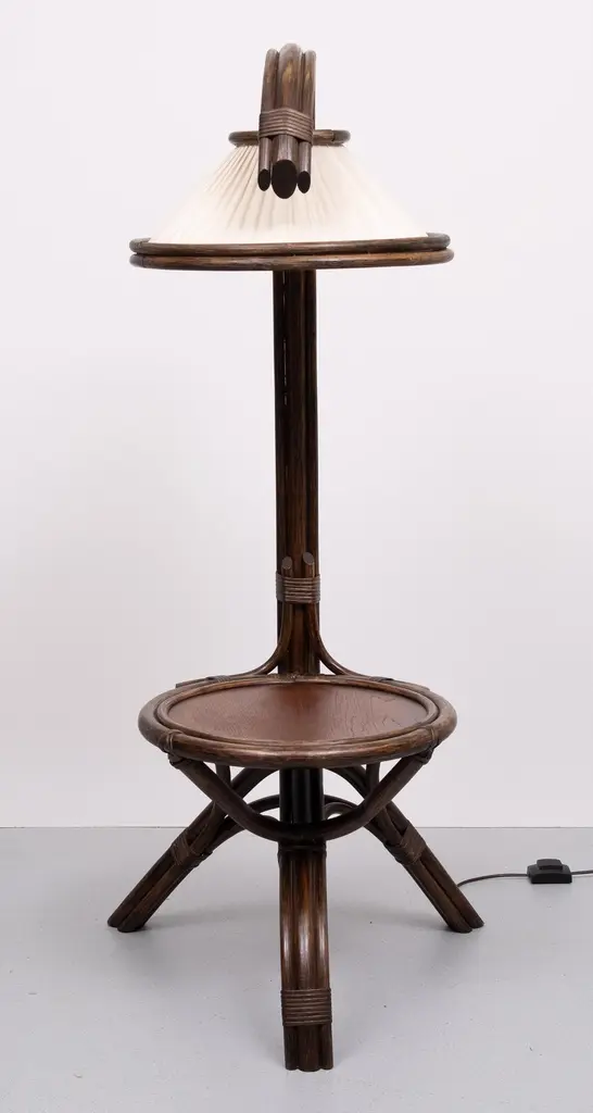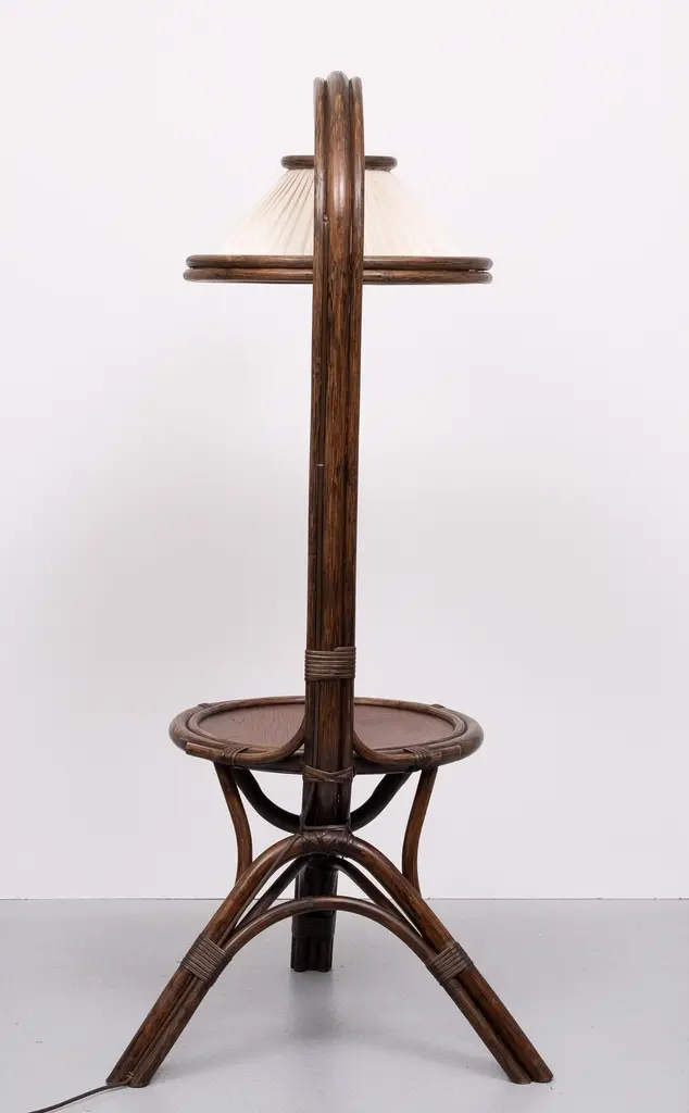 Beautiful Floor lamp with table. Hand made Rattan . Linen shade .Very good condition . 1970s .One large E27 bulb needed. foot switch .