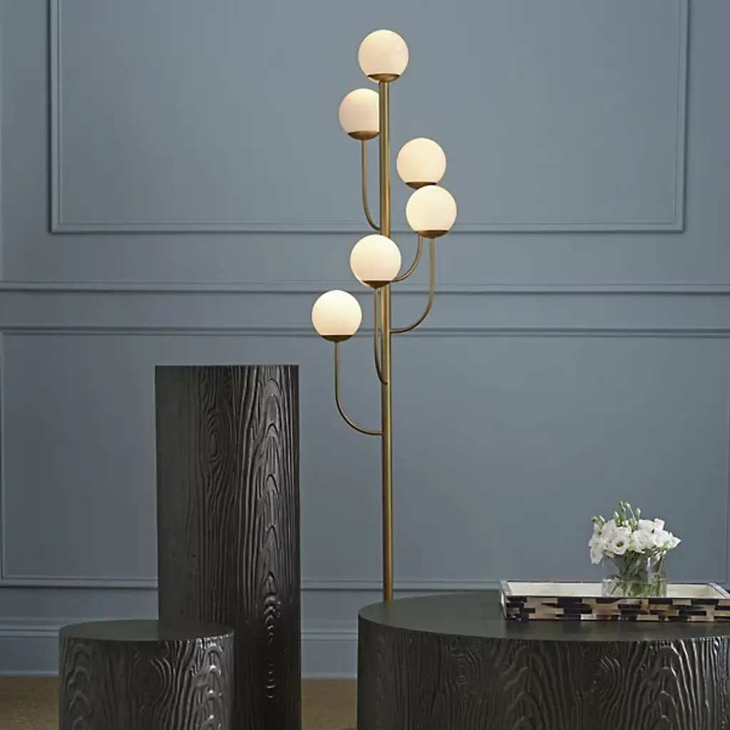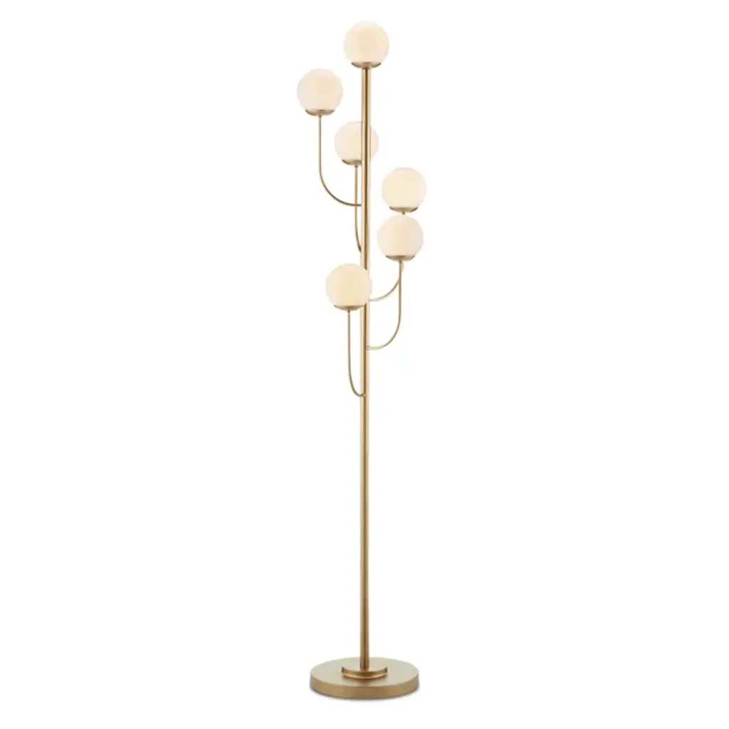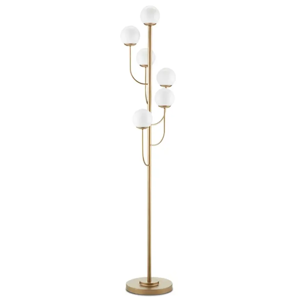 The Farnsworth Floor Lamp by Currey & Company captures the elegant elements found in mid-century modern designs, making the ever-popular glass globe a central part of this design. Supported by a round base and simple stem, a series of gracefully arched, slender arms reach up to display a collection of smooth, spherical glass globes in a striking, staggered arrangement. Completed with a beautiful finish, this bright lamp is a sophisticated way to illuminate rooms.
