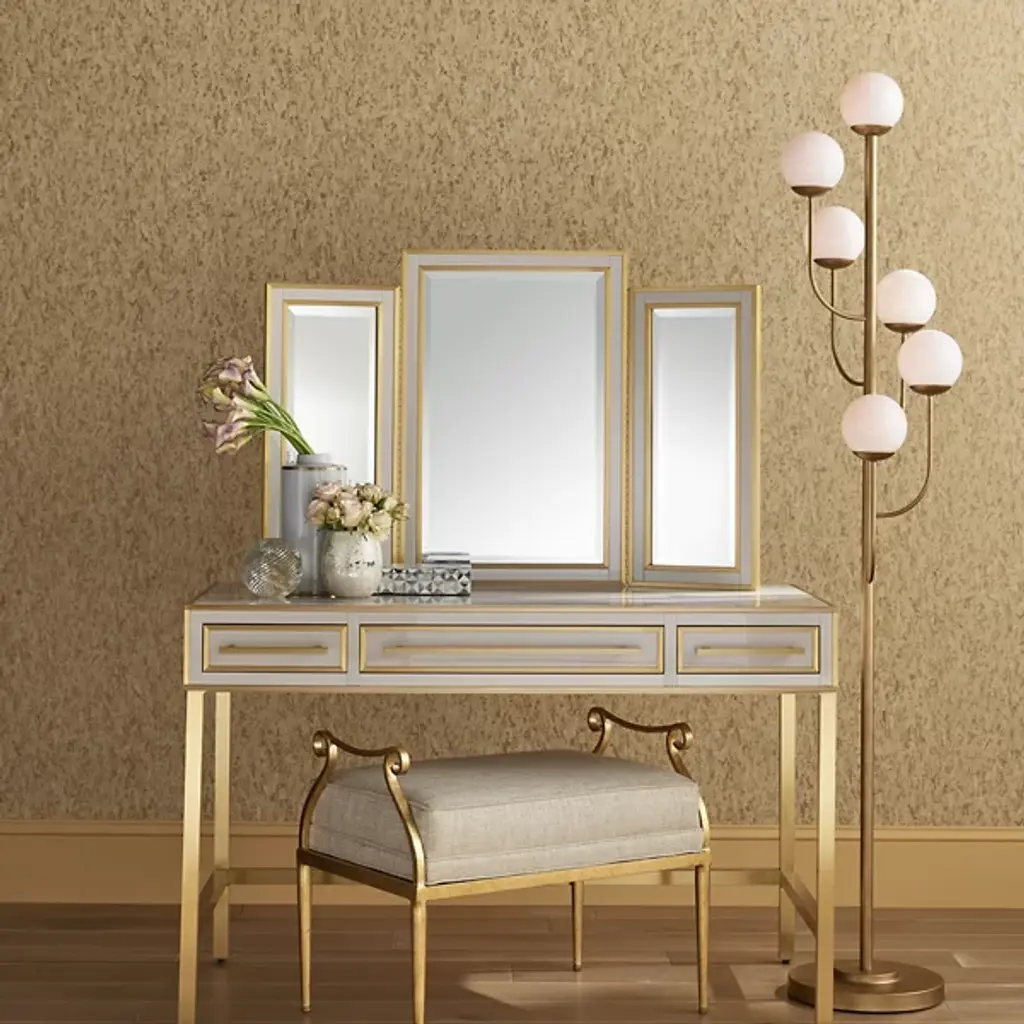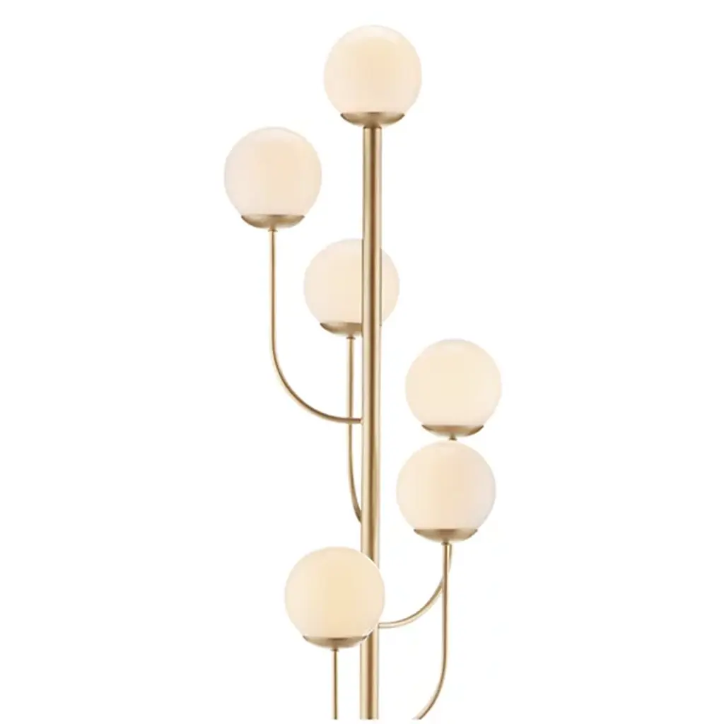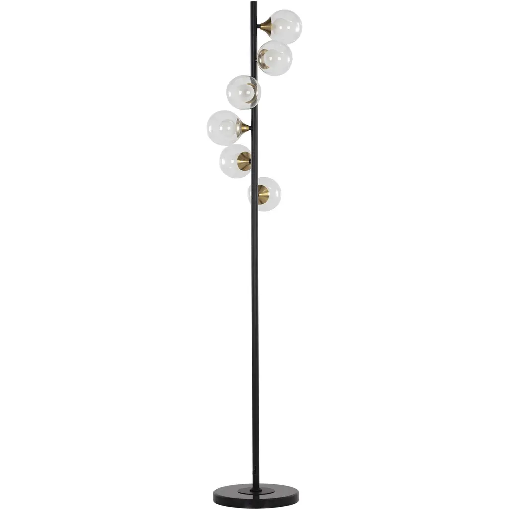 The Farnsworth Floor Lamp by Currey & Company captures the elegant elements found in mid-century modern designs, making the ever-popular glass globe a central part of this design. Supported by a round base and simple stem, a series of gracefully arched, slender arms reach up to display a collection of smooth, spherical glass globes in a striking, staggered arrangement. Completed with a beautiful finish, this bright lamp is a sophisticated way to illuminate rooms.