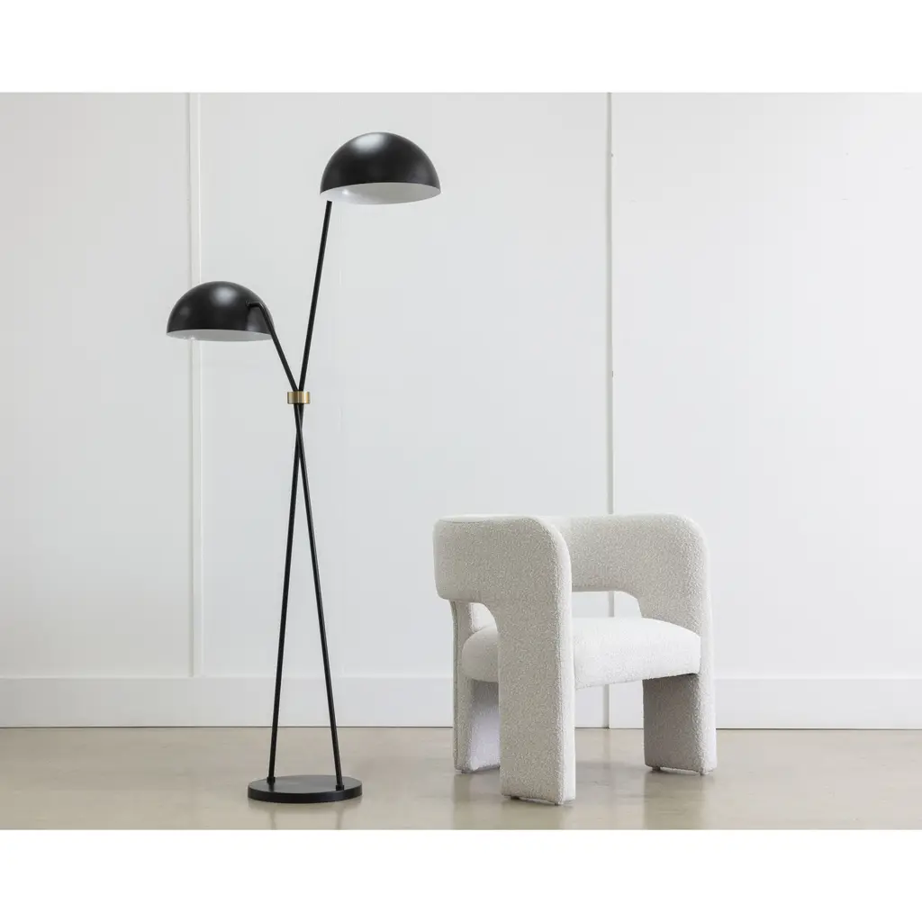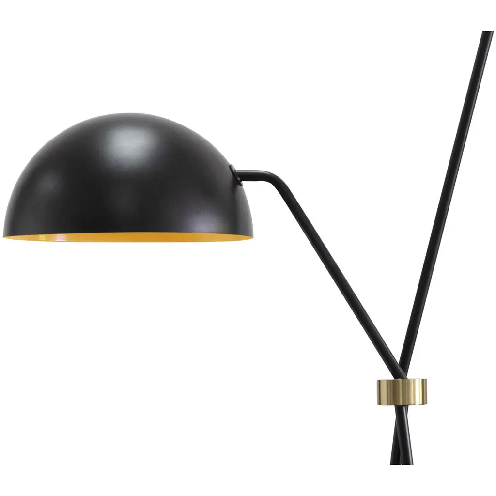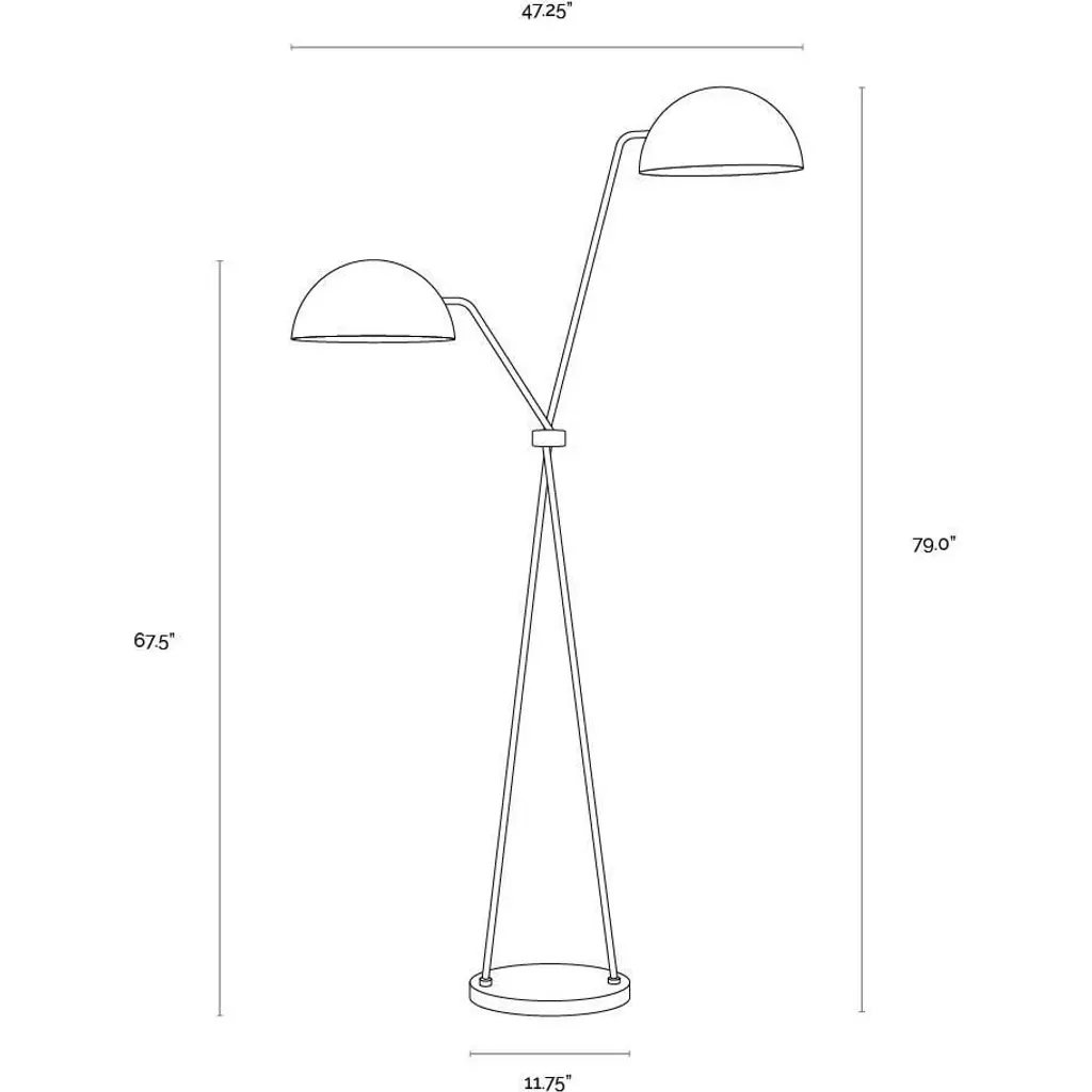 Modern illumination is defined in this dual-domed floor lamp. Features a sturdy powder-coated black iron base with two sleek poles of varying heights crossed together with a brass iron ring. Black lamp shades complete the look.