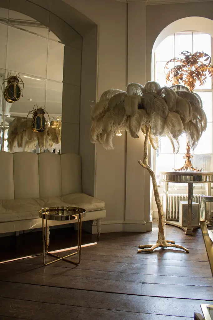 The feather floor lamp, edition piece by A Modern Grand Tour.An illuminating palm tree, resplendent with exquisite ostrich feather foliage, the feather floor lamp takes centre stage in any luxury setting and delivers the ultimate midas touch to Hollywood regency decors. A pièce de résistance among standing lamps, this lighting work of art commands attention to its exquisite design and intricate craftsmanship.
