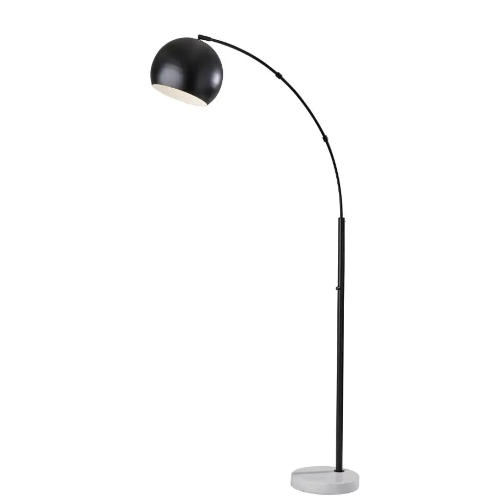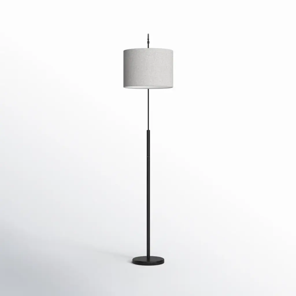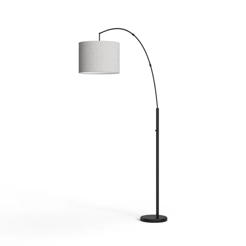 Create a glow-zone. Crafted from steel, this slender arched lamp delivers reading light – and dramatic curves – without taking up too much floor space. A circular base provides contrast + stability, while a neutral linen drum shade softens the light and the look.