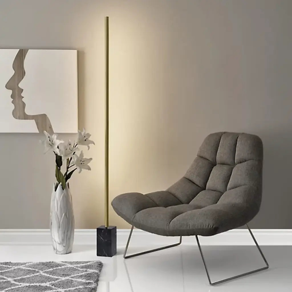 The Felix LED Floor Lamp from Adesso combines a rectangular marble base with a slender aluminum rod to create focused task lighting. Designed in 2017, this piece positions an acrylic LED strip along one edge of the vertical rod, directing illumination downward and outward from the fixture. The marble block provides stability while adding material contrast to the metal stem. Touch controls integrate into both the head and base, offering dimming capability and on/off switching, while the linear LED configuration delivers consistent light output along the acrylic length.
