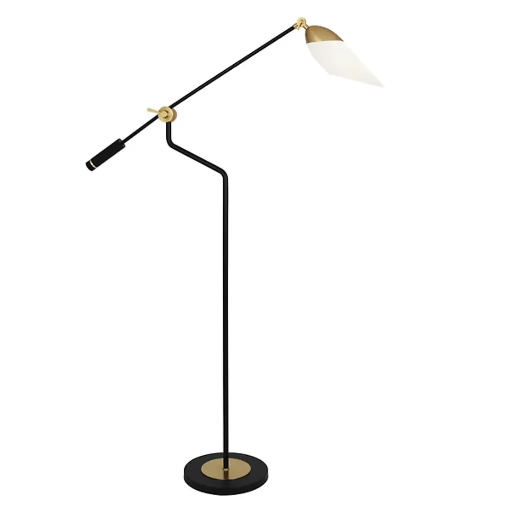 Guide the light in your home in taste and style with the Ferdinand Floor Lamp from Robert Abbey. Made of smooth metal with clean brass accents found throughout, this modern piece consists of a thin, appealing silhouette that allows it to be placed in a range of rooms, blending in with ease. The stem-like body gracefully curves as it leads to an adjustable handle and a separate bar that contains a handle counterweight and a sharply angled cased white glass shade. The single bulb within the shade can be precisely directed at will, however you desire.