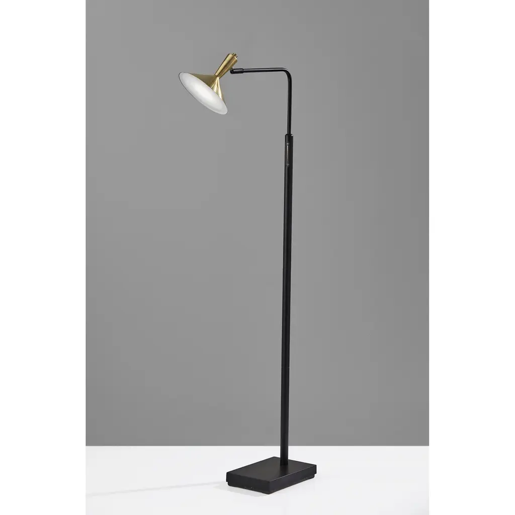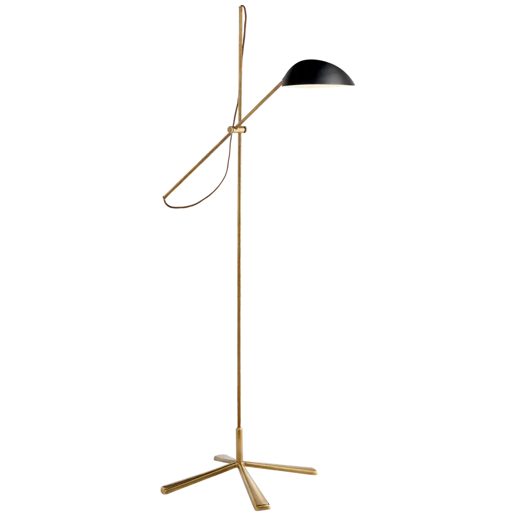 Guide the light in your home in taste and style with the Ferdinand Floor Lamp from Robert Abbey. Made of smooth metal with clean brass accents found throughout, this modern piece consists of a thin, appealing silhouette that allows it to be placed in a range of rooms, blending in with ease. The stem-like body gracefully curves as it leads to an adjustable handle and a separate bar that contains a handle counterweight and a sharply angled cased white glass shade. The single bulb within the shade can be precisely directed at will, however you desire.