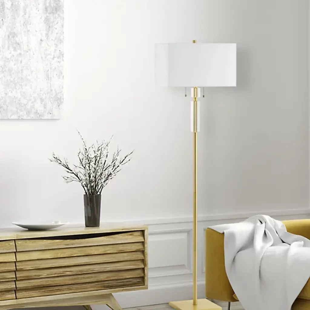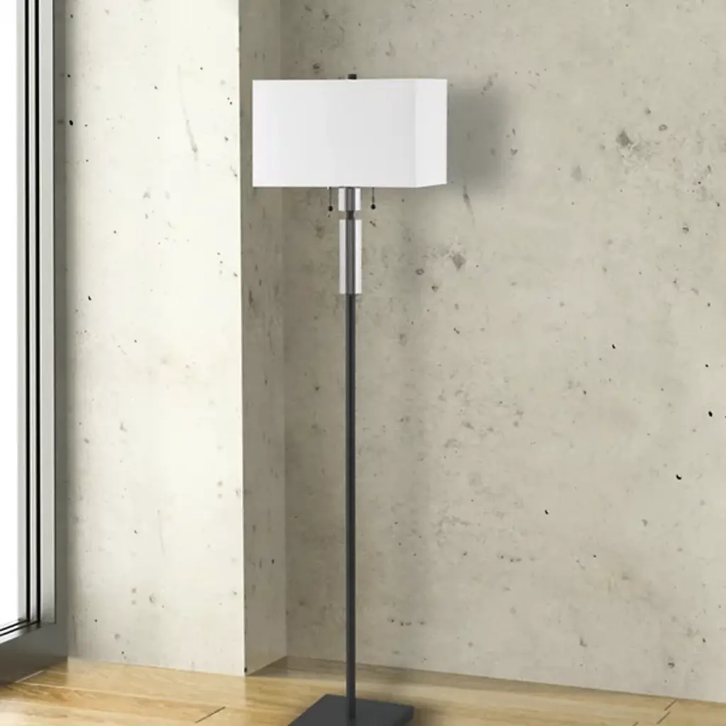 A minimalist lighting design with a sparkling touch of Art Deco glamour. The Fernanda Floor Lamp by Dainolite has a long and slender stem that extends in-between a weighted square base and a rectangular fabric shade. The top of the stem is adorned with refined crystalline accents, which shimmer warmly when the lights above are turned on. Easy-to-reach pull chains control each of the 2 lights independently. An elegant addition to a living room or reading area.