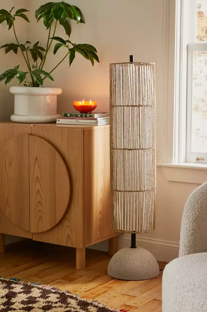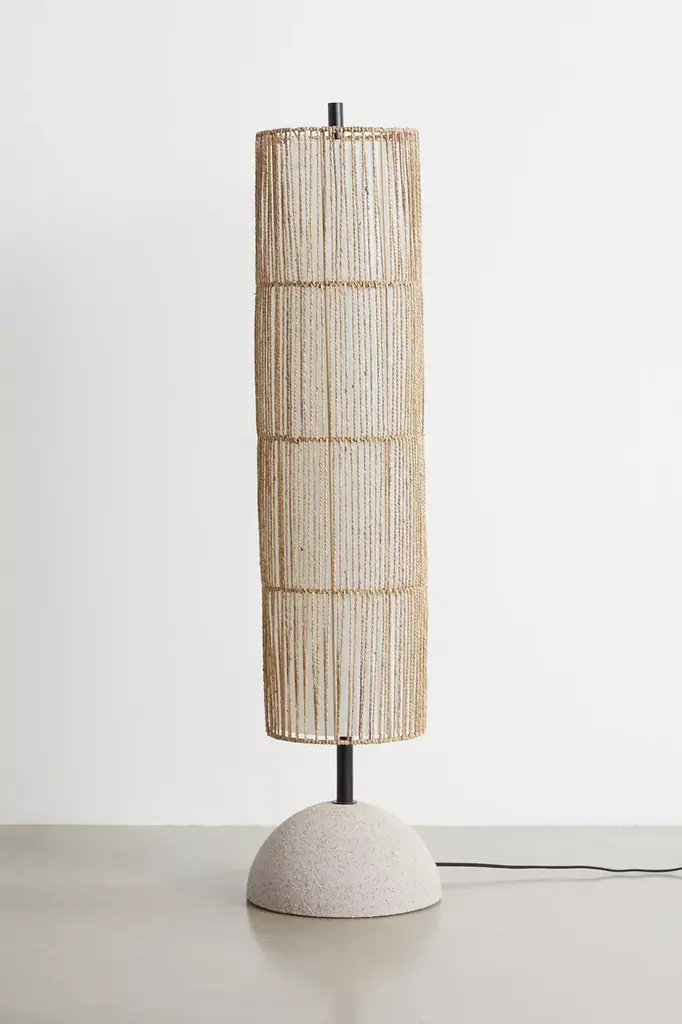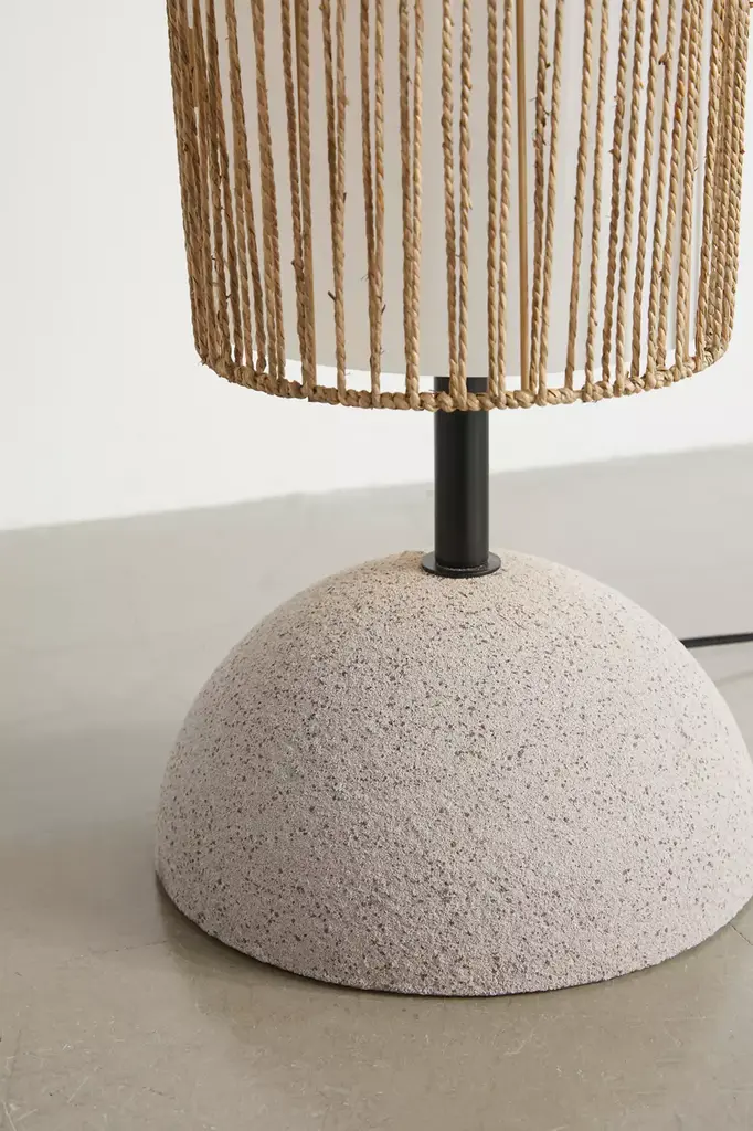 Create an artfully boho scene with your lighting when you display this floor lamp in a short silhouette we love. It features a textural cylindrical-shaped shade and statement dome-shaped stone base. Plugs in to power on. Available exclusively at Urban Outfitters.